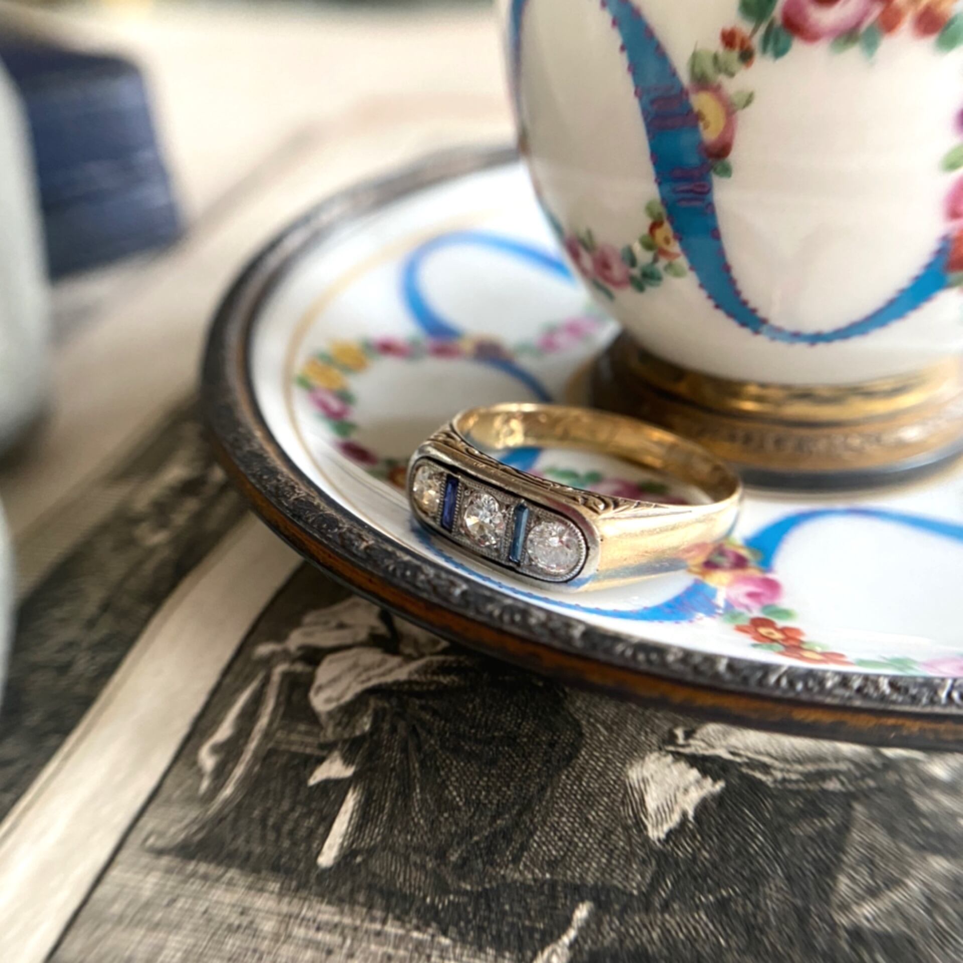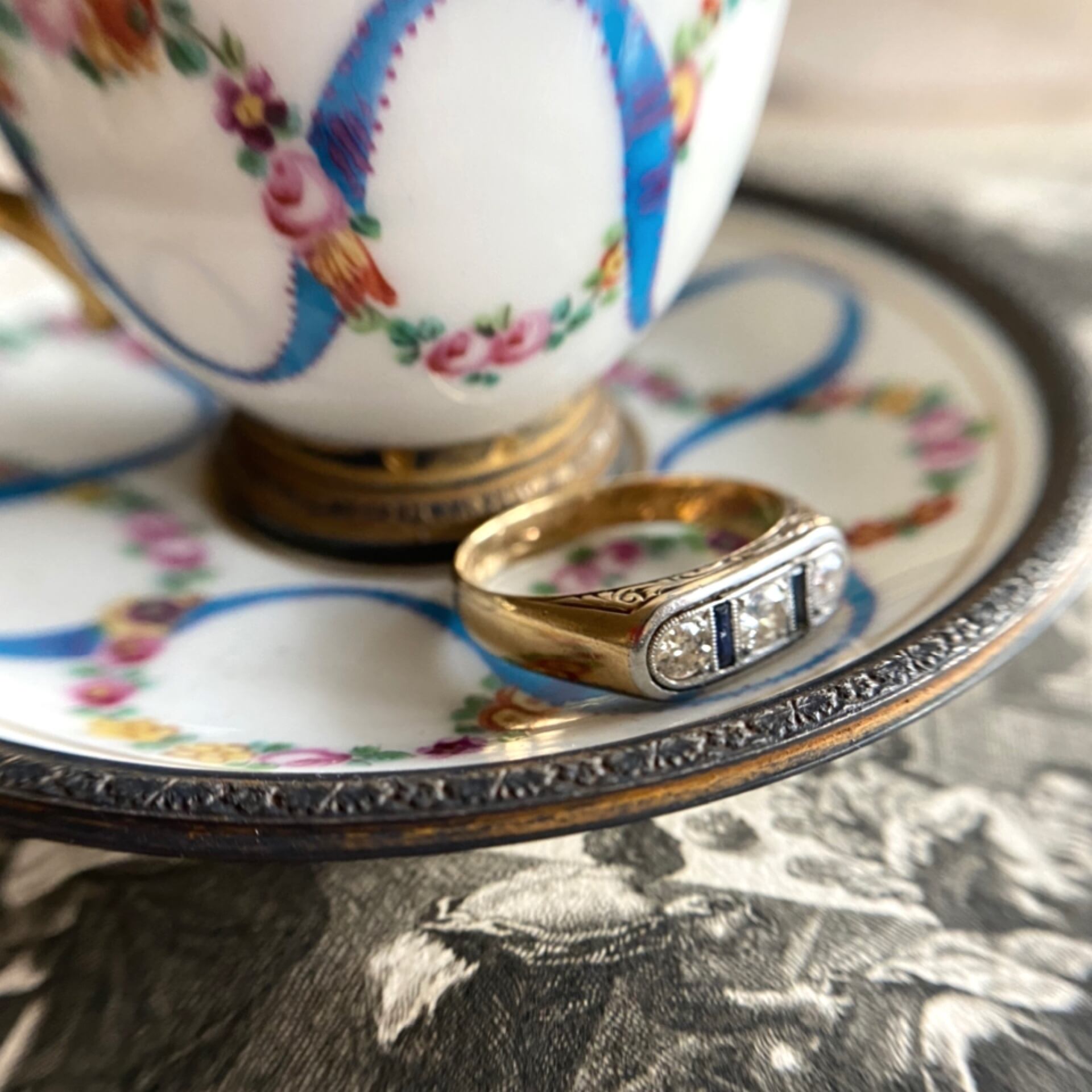 ダイヤモンドが3つベゼルセットで並べられた白がメインのリングにはっきりとした濃い色のブルーサファイアを差し色としてセットする事で全体的にメリハリが出て、色彩的にも引き締まります。