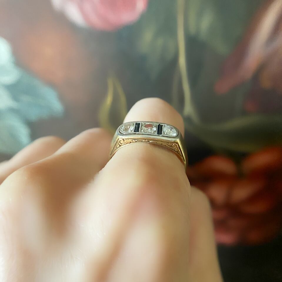 プラチナにゴールドバックの組み合わせ、石を覆う細やかなミルグレインはエドワーディアンの特徴でもありますが、こちらのリングはその感性を残したアールデコのリングと推測します。