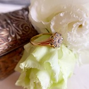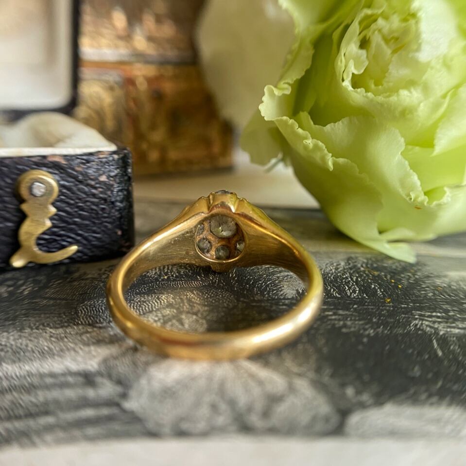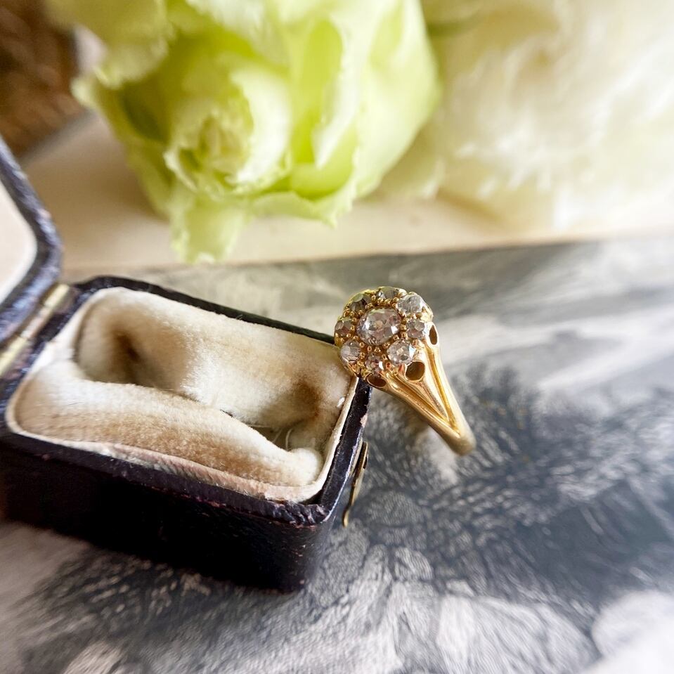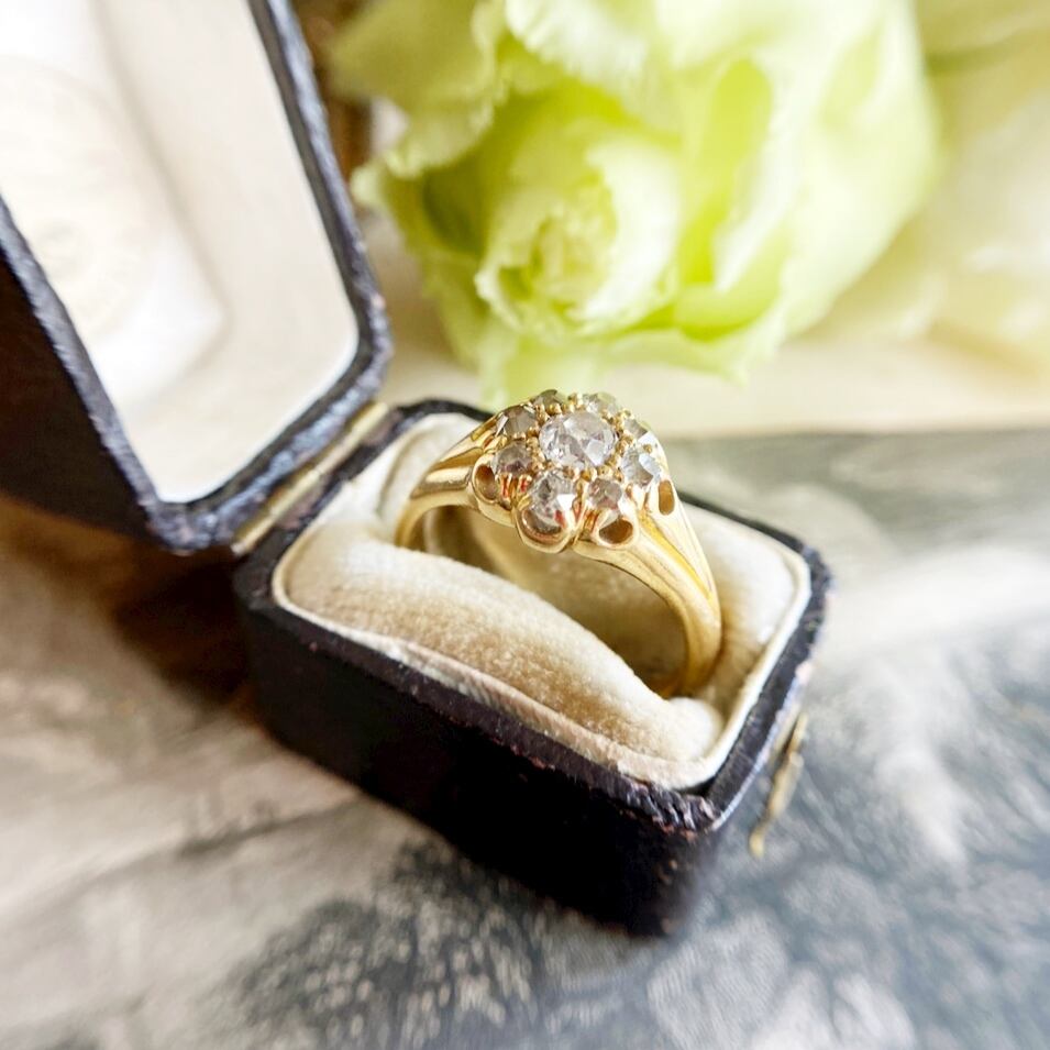 オールドマインカットダイヤモンドのキラキラした輝きがイエローゴールドの地金に反射する美しいヴィクトリアンクラスターリング。