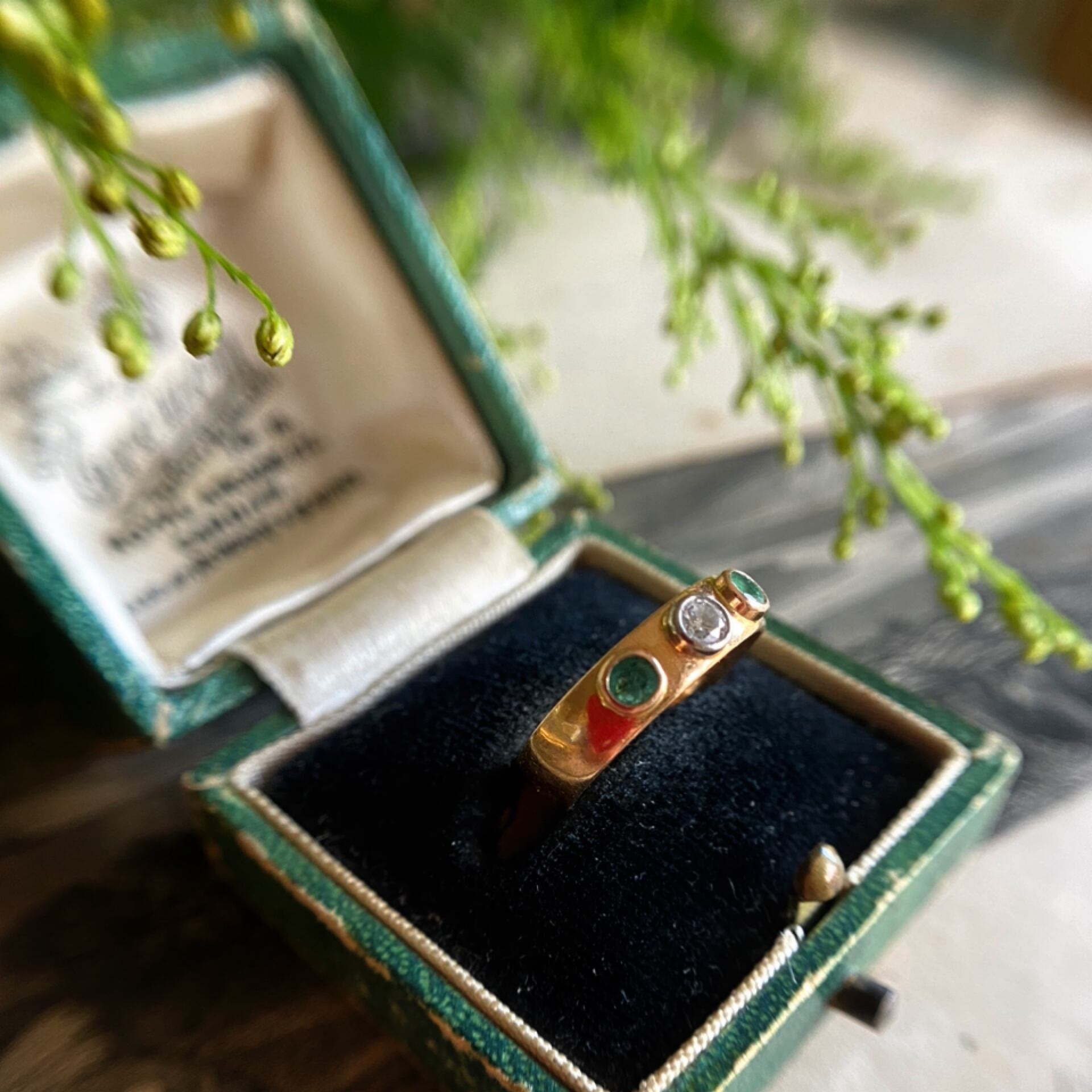 小さな3mm程のダイヤモンドとエメラルドが間隔を置きポツンとベゼルセットされ、アンティーク故にエメラルドの色味が若干違うものの、究極にシンプルな様子は普段使いにさりげなくお手元を明るくしてくれる便利なアイテムになる事間違えなしのひと品です。