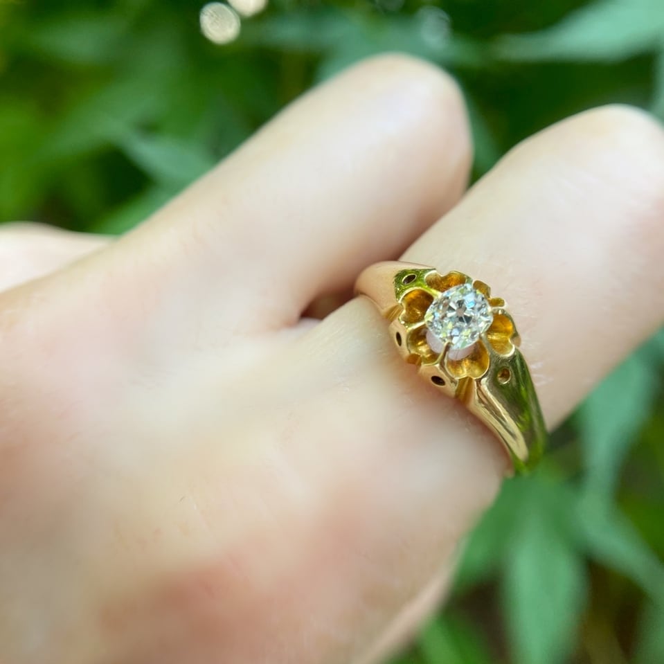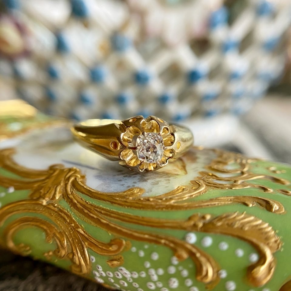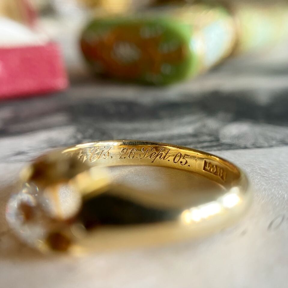 飾り気のないゴールドのシンプルなシャンクとフェイス、そしてその中央に輝くのは0.35ctのオールドマインカットの瑞々しいダイヤモンドが凛と光る美しいリング。