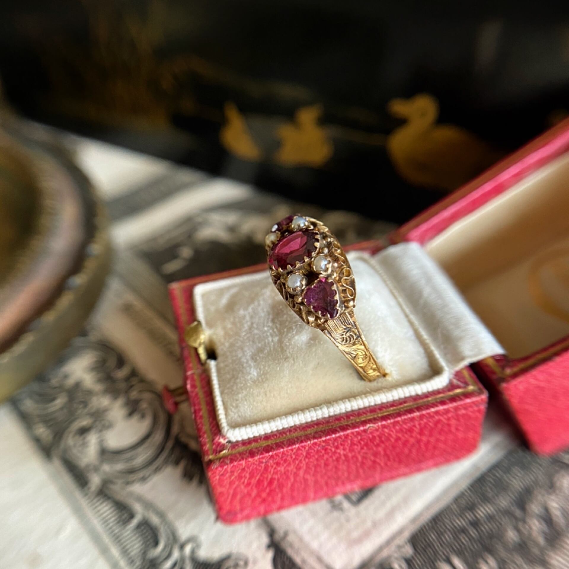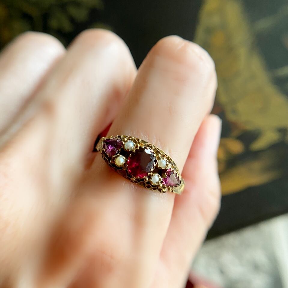 バラのような真赤な色が印象的なアルマンディンガーネットを中央に配し、両脇にはロゼワインのようなピンクがかった色味のロードライトガーネットを配したヴィクトリアンリング。