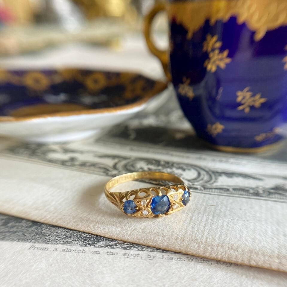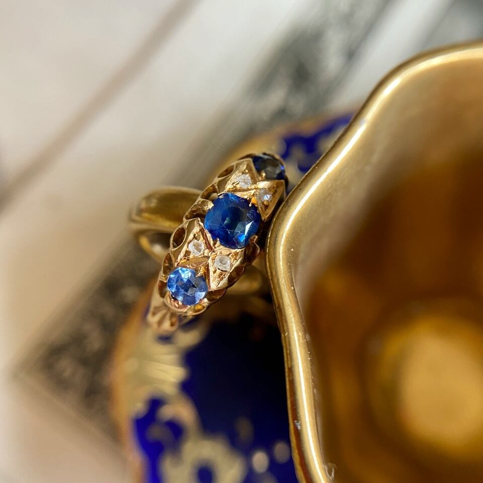 3石の色の深みや透明感が美しいブルーサファイアの合間には4粒の荒削りされた小さな小さなローズカットダイヤモンドを添えて飾って華やかなに仕立てたヴィクトリアンリング。