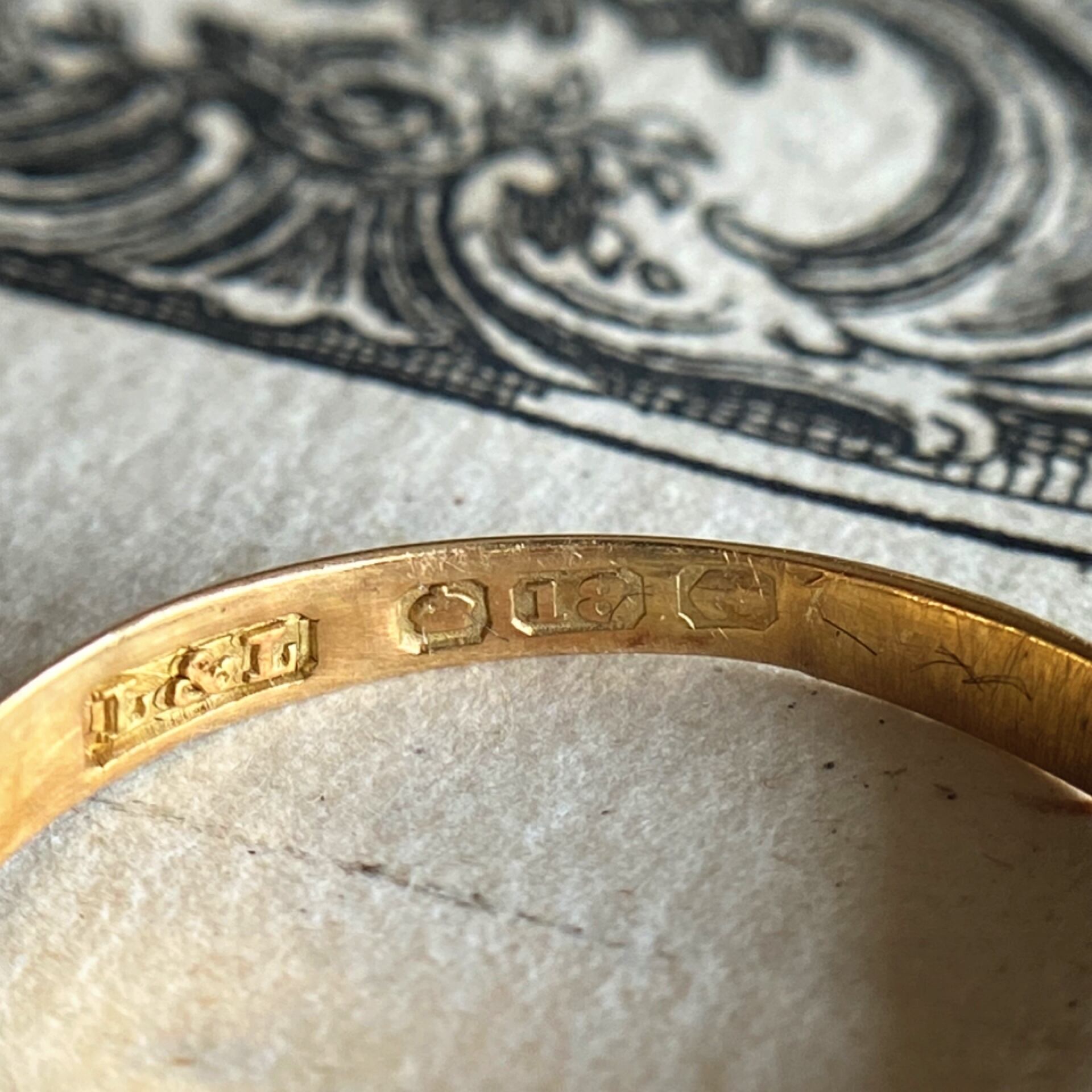 バーミンガムの刻印と、18金ゴールドの刻印、メーカーの刻印まで綺麗に残っていますが年号の刻印は残っていない為読み取ることができませんが、リングのスタイルからしますと、ヴィクトリア時代の終わり頃に作られた作品だと思います。