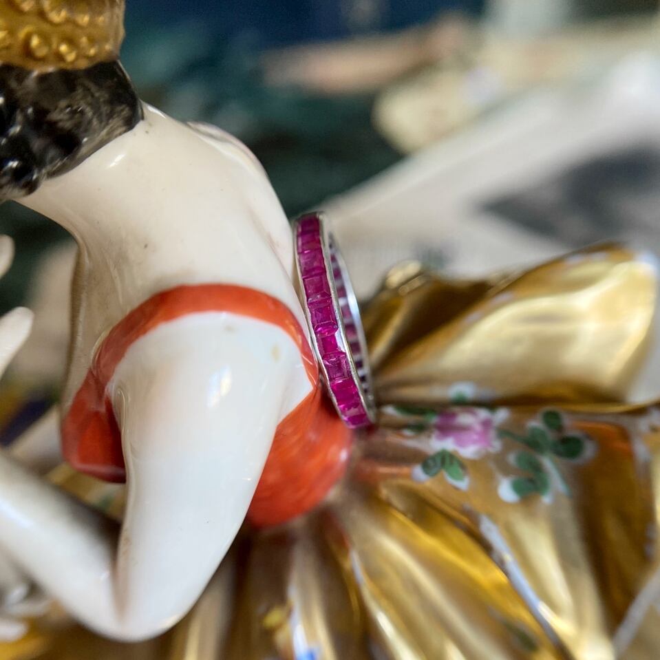ルビーが石畳のように隙間なく一周円を描きながらプラチナの台座に敷き詰められ、正に神業と言っても過言ではないのでしょうか。