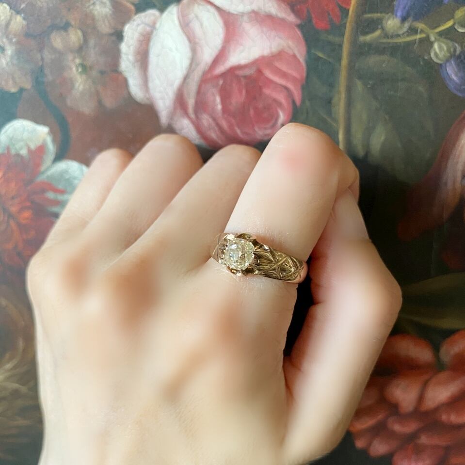 ほんのりイエロー味を帯びたオールドマインカットダイヤモンドがローズゴールドのシャンクに溶け込み、その一体感が美しいバンドリング。