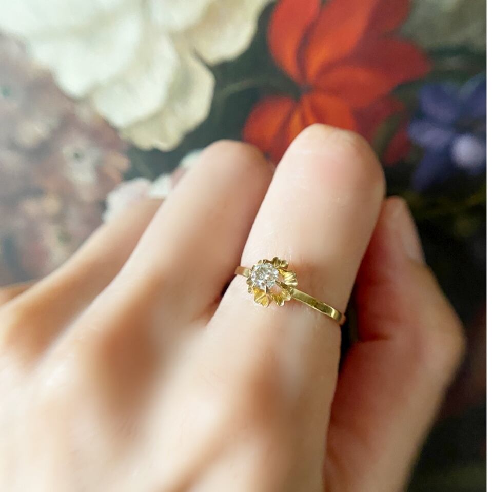 シャンクには全く装飾がない為、花型の台座が際立ち、ゴールドの地金と共鳴し、輝きを増し、咲くように輝く光の華が手元を愛らしくさりげなく飾ってくれます。