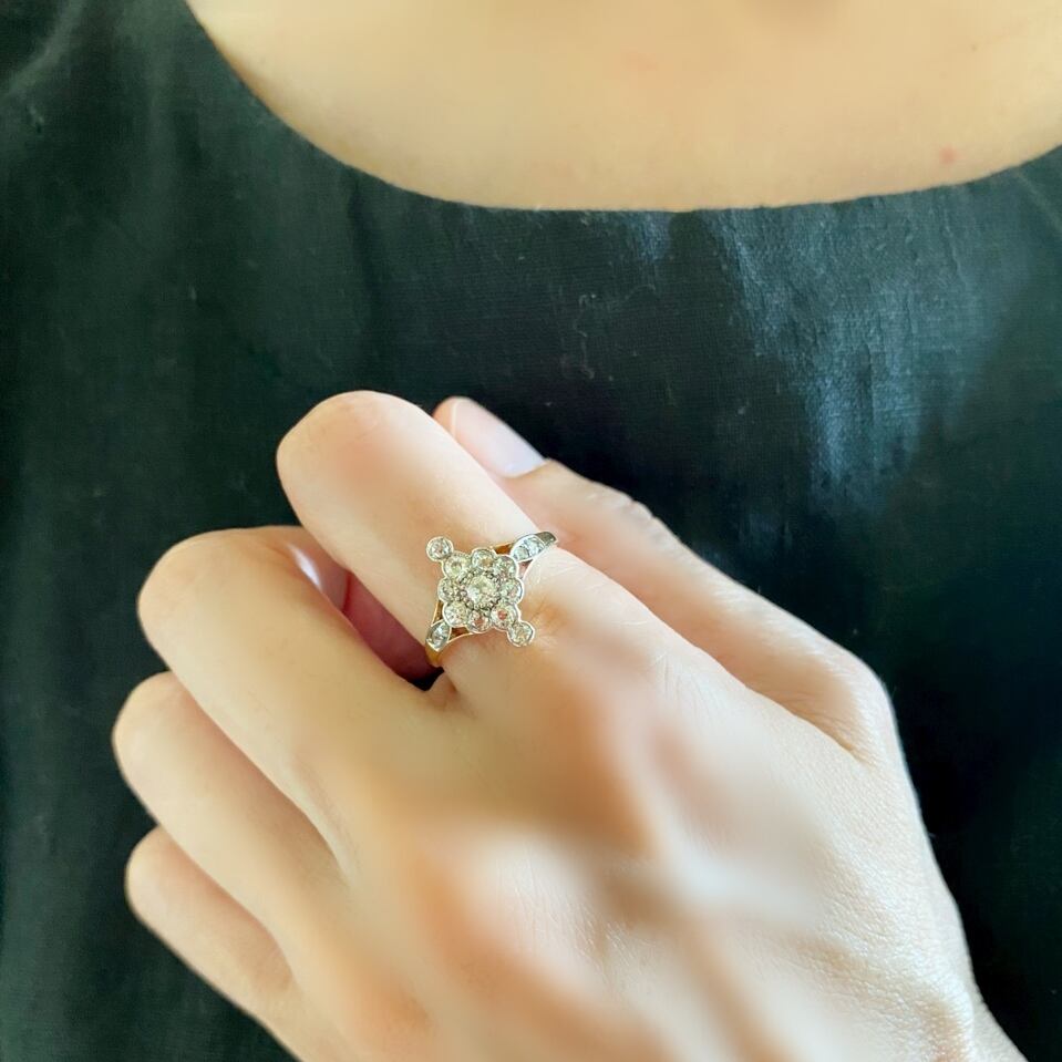 真ん中に一回り大きいオールドヨーロピアンカットダイヤモンドを1粒、その周は8粒のダイヤモンドで花弁を象ったデイジーマーキーズリング。