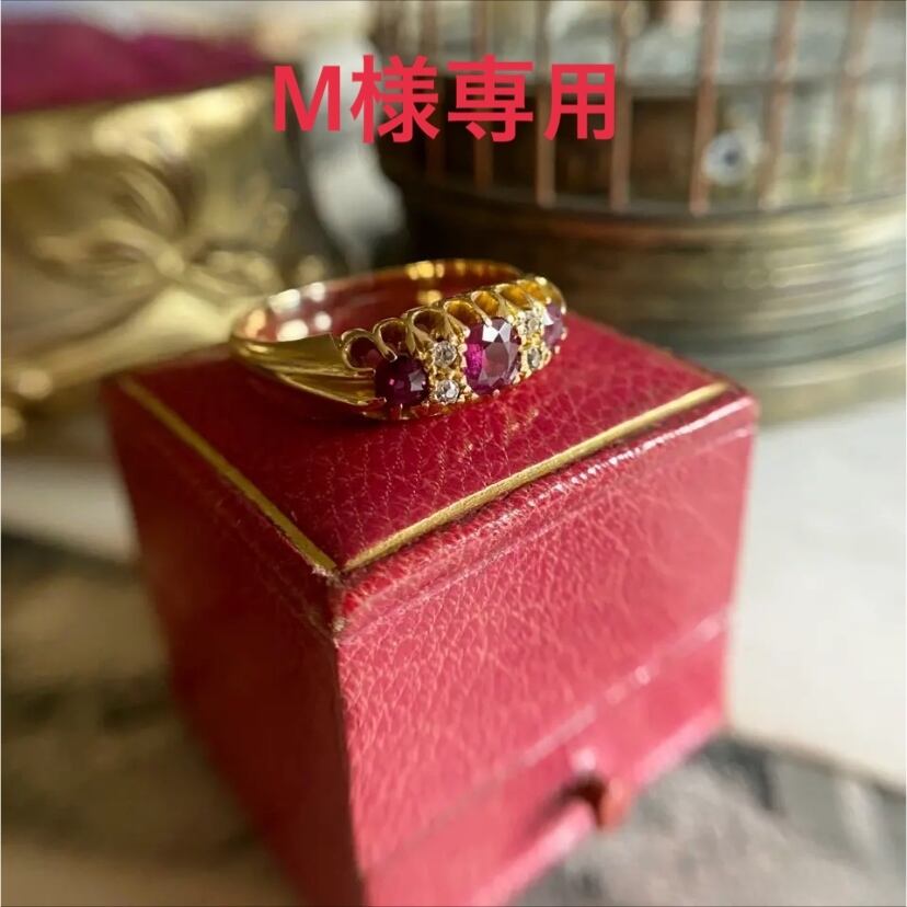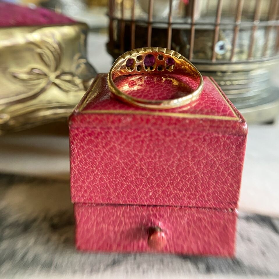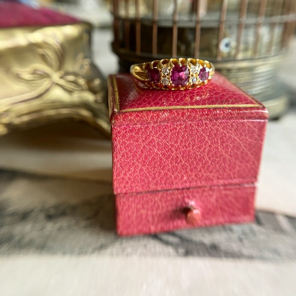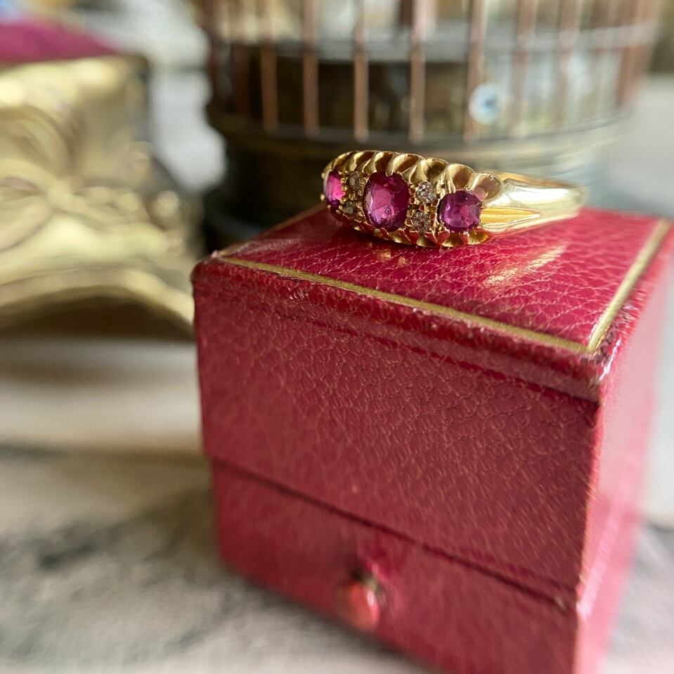 3石の美しい色のルビーの合間には4粒の小さな小さなシングルカットカットダイヤモンドを添えて華やかなに仕立てた20世紀初頭のエドワーディアンリング。