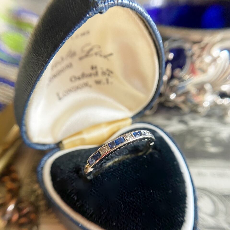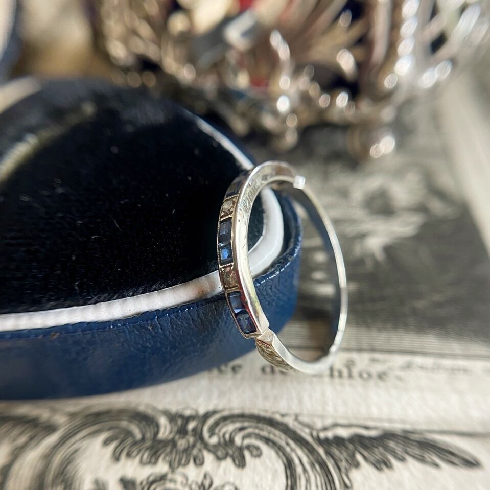 プラチナと、ブルーサファイアそしてダイヤモンドのコンビネーションが涼しげで指元にさり気なく溶け込んでくれるハーフエタニティーリング。