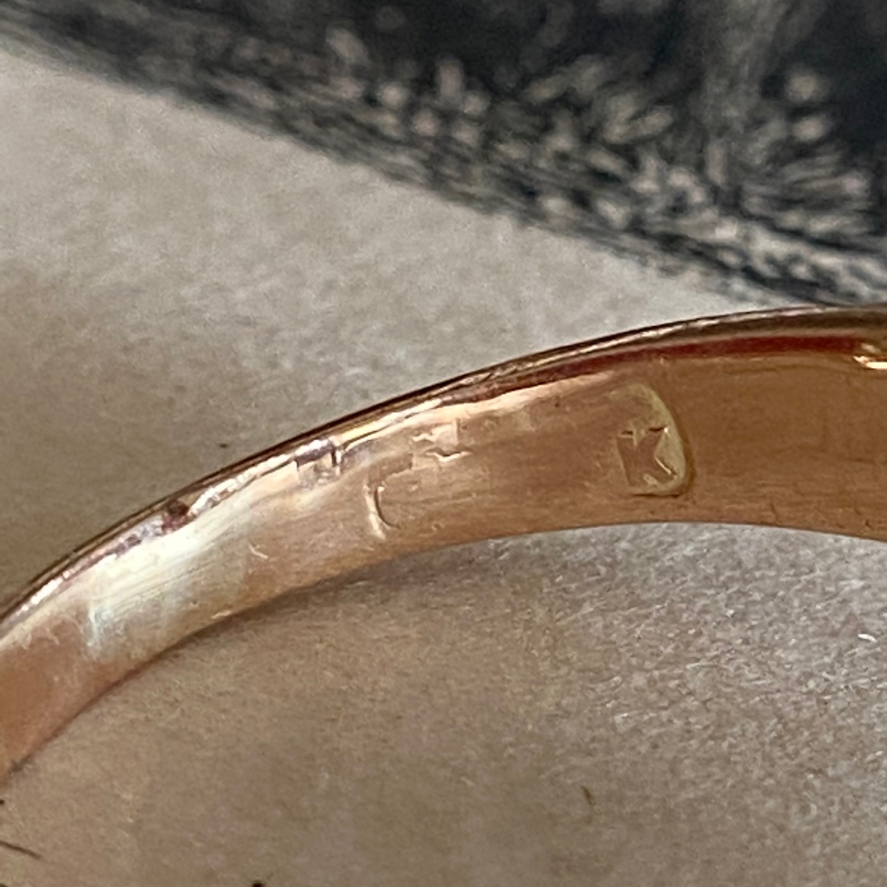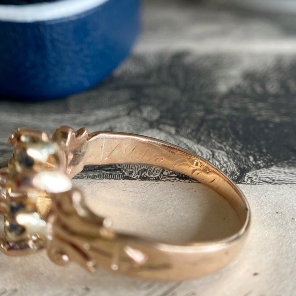 中央には花芯に見立てた小さな2.8mm程のオールドマインカットダイヤモンドを、その周りには花弁に見立てた1.8mm程のブルーサファイアを4石セットし、その間には中央から伸びた金棒を花糸として、そしてやくに見立てた金粒、19世紀後半のヴィクトリアンリング。