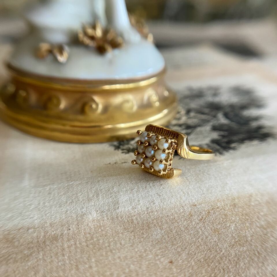 正方形の升に9粒のシードパールがお行儀よく整然と並んだクロスオーバーリング。