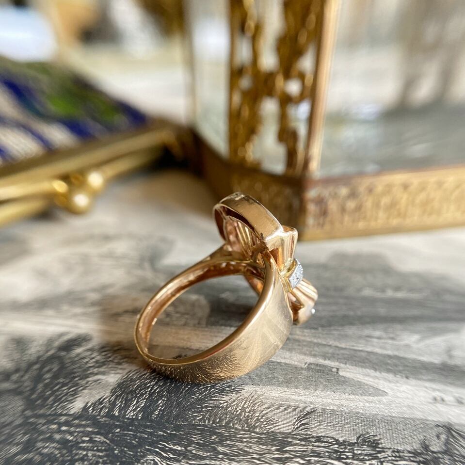 こちらのリングはその全てが詰まったリングと言っても過言ではなく、ダイナミックなボリューム、肉厚のイエローゴールドのシャンクのアシンメトリーの太さ、シングルカットダイヤモンドがセットされている地金部分のみプラチナを使用し、クレッセントの下は月の光線を表現しているようにも思える金線が細工され、ボウタイのようなリボンにもちゃんと筋が入っていて、一見ダイナミックで大胆だけに思われがちですが、立体的で細部まで手の込んだ造りがやはりヴィンテージリングの特徴なのだと思います。