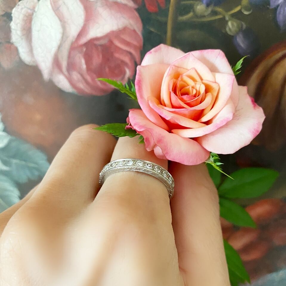 こちらのエタニティーも、ダイヤモンド一つ一つが微妙に違い、その一つ一つを斜めのスリットで枠取りをし区切られ、また、両側面には植物模様が手彫りされ、立体感がうまれ、手の込んだ作りに見入ってしまうほどです。
