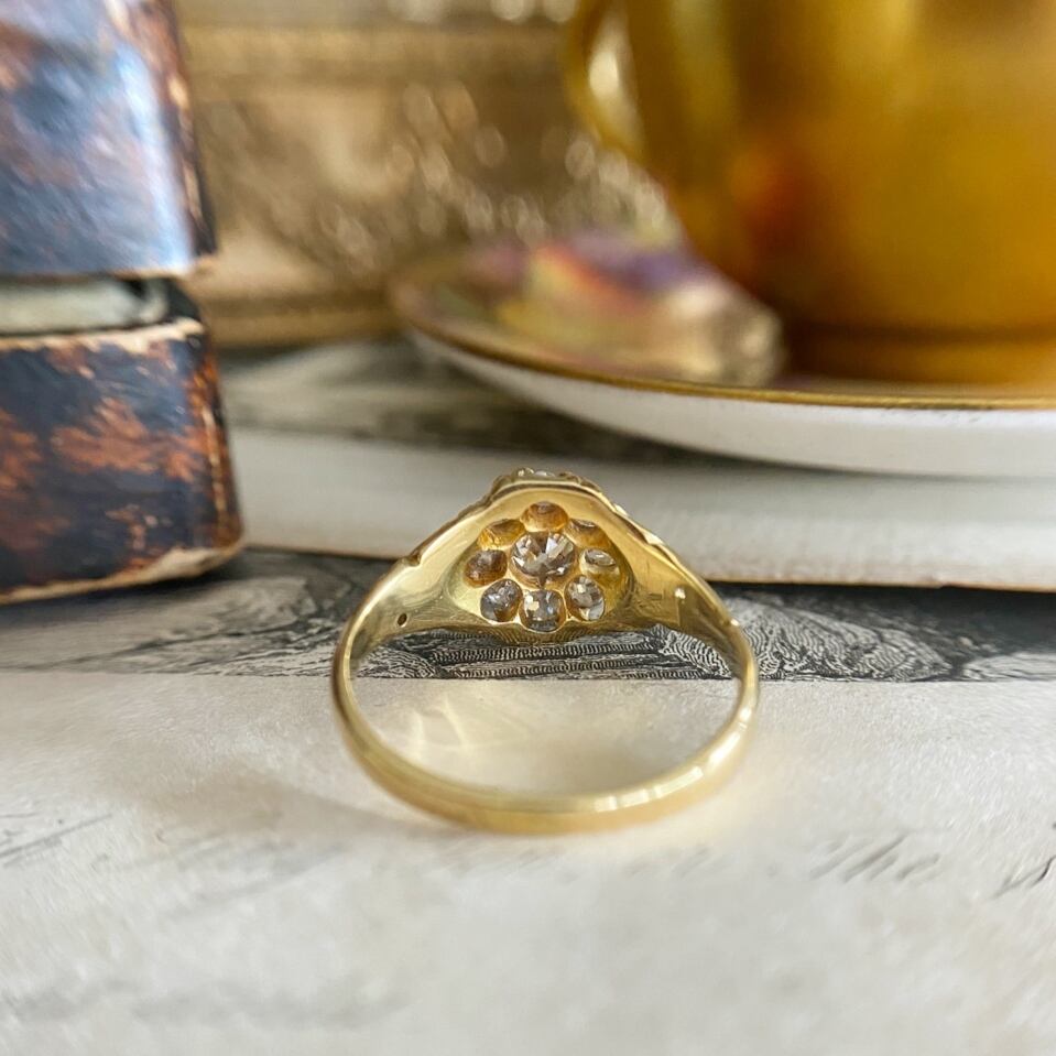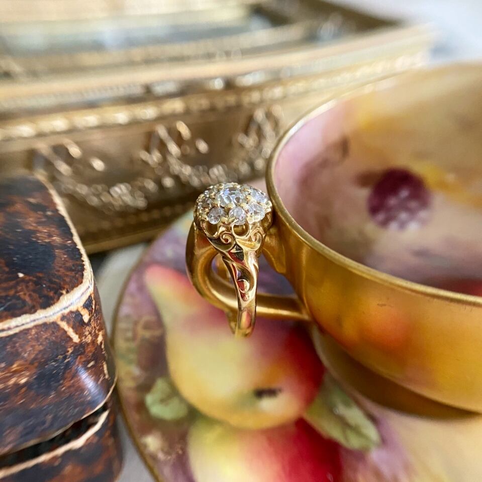 オールドヨーロピアンカットダイヤモンドのキラキラした輝きがイエローゴールドの地金に反射する美しいヴィクトリアンクラスターリング。