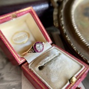 小さな小さな空間にルビーを隙間なくきっちり包んだゴールドの丸い枠、石と石の間の爪を見せない技法は20世紀に入ってから登場した技法で、特に1920年頃の幾何学的な様式を用いたアール・デコ様式の時に一世を風靡しました。