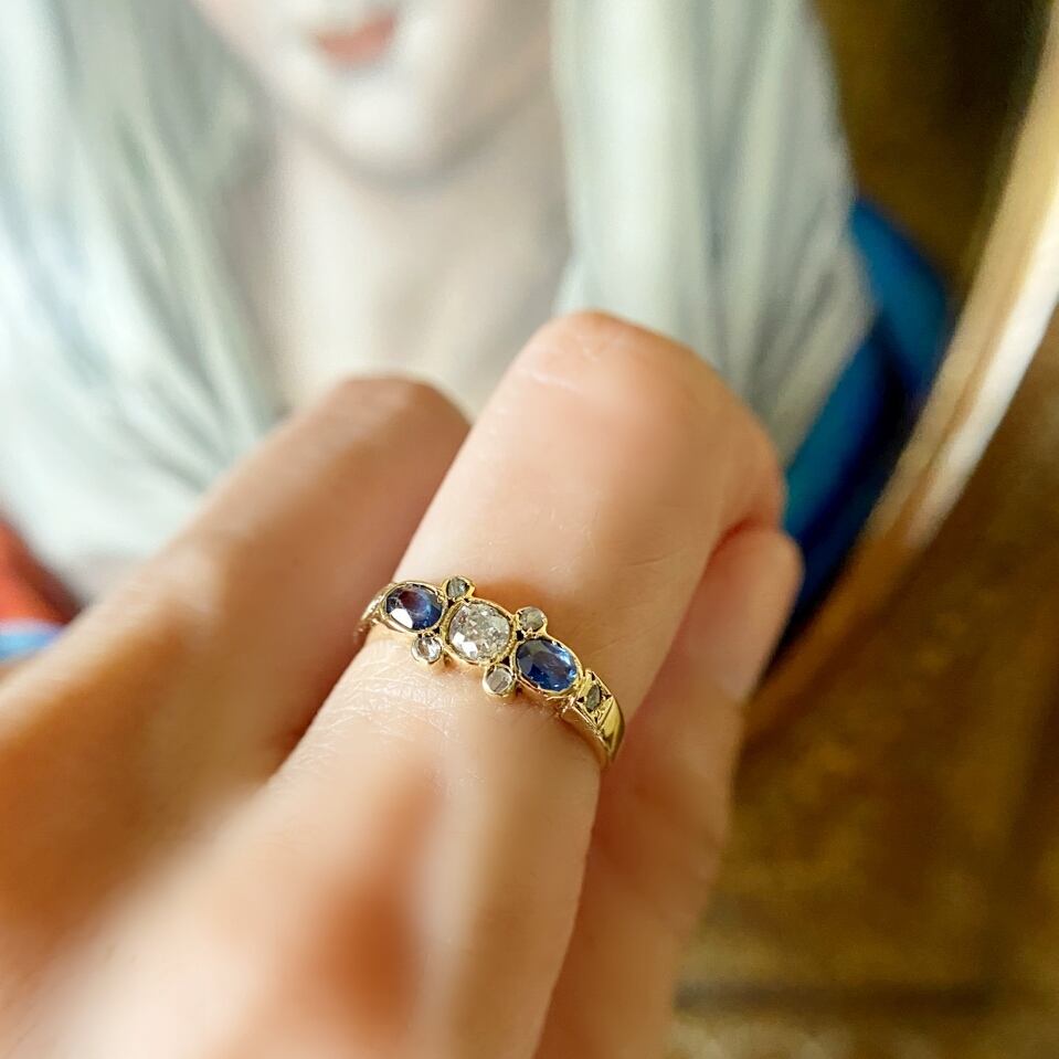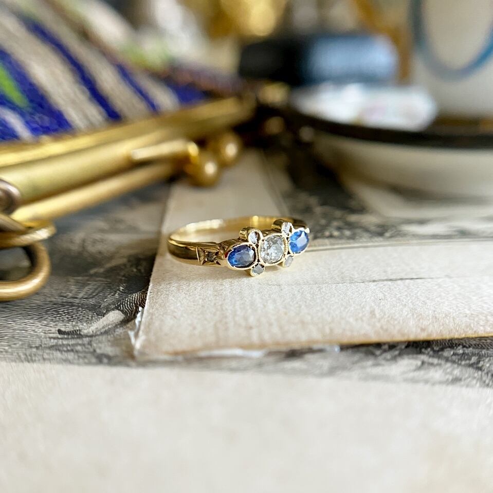 18kゴールドのフェイスの中央にはオールドマインカットダイヤモンド、その両脇にはオーバルカットのサファイア、その間に小さなローズカットダイヤモンドを4粒をセットしたスリーストーンリング。