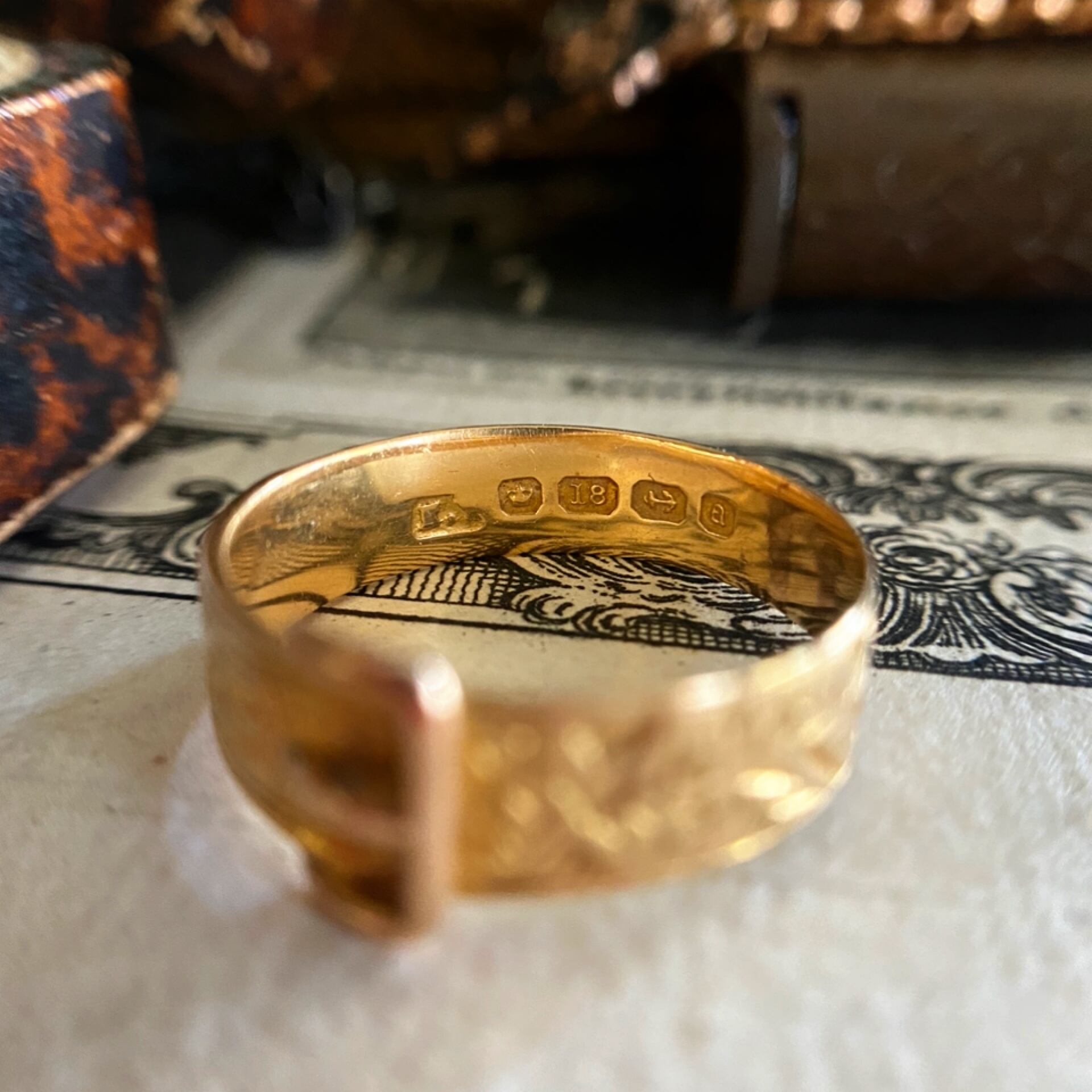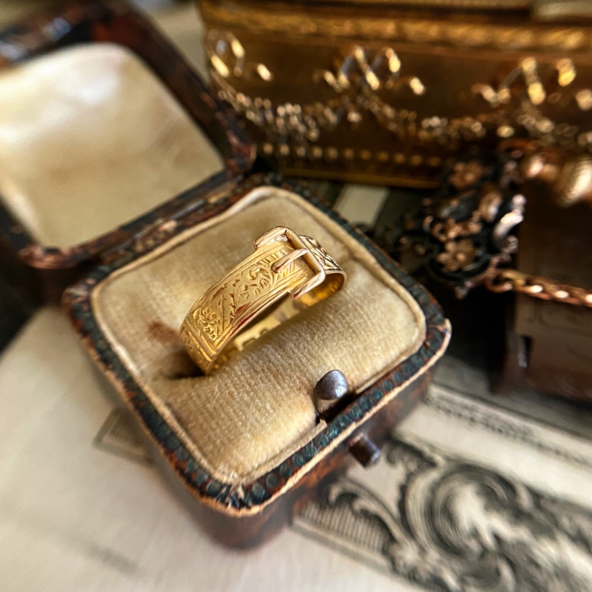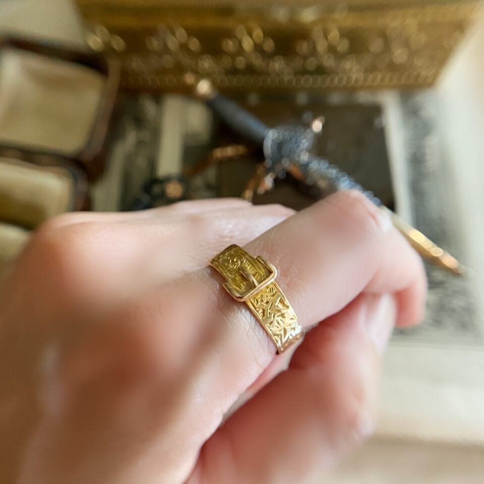 19世紀後半から20世紀前半にかけてこのスタイルのリングを見かける事ができます。シンプルな物から宝石を散りばめた物までデザインも様々。同じベルトバックルなのに、こんなにも色々なバリエーションがあると、ついつい集めてしまいたくなります。(当店ネットストアにも他に2点ございます。)