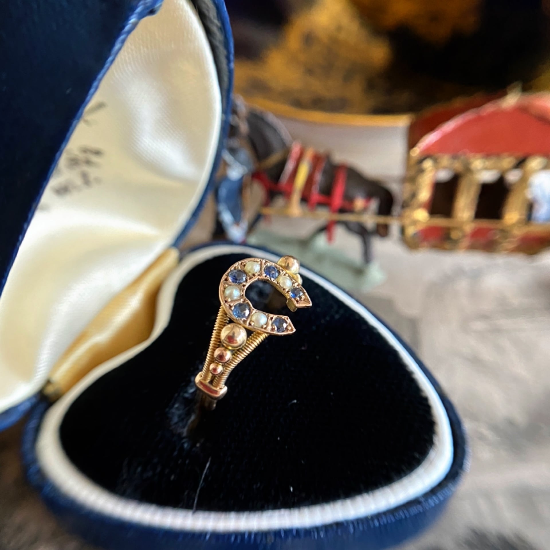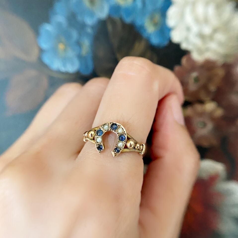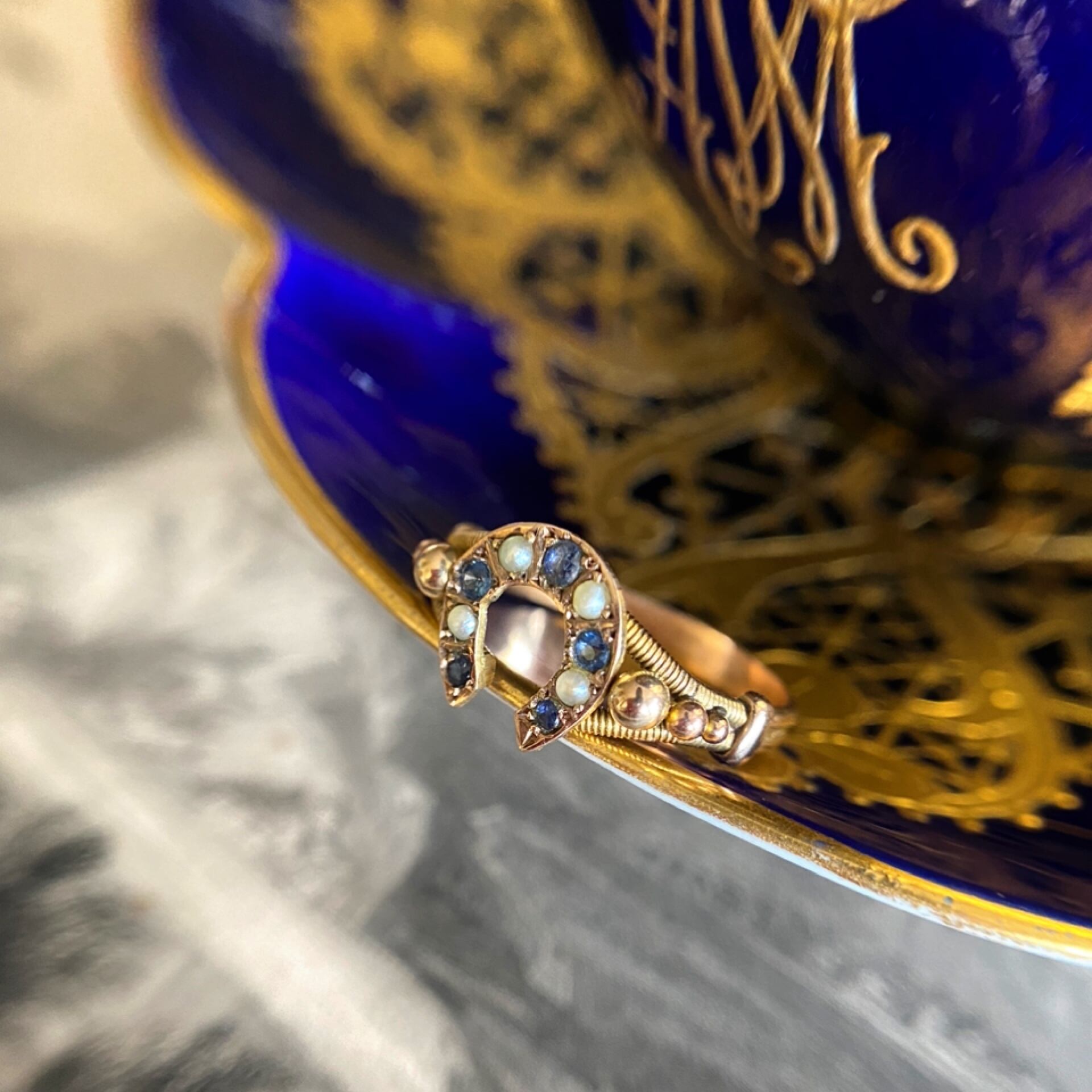サファイア&ナチュラルパールホースシューヴィクトリアンリンリング