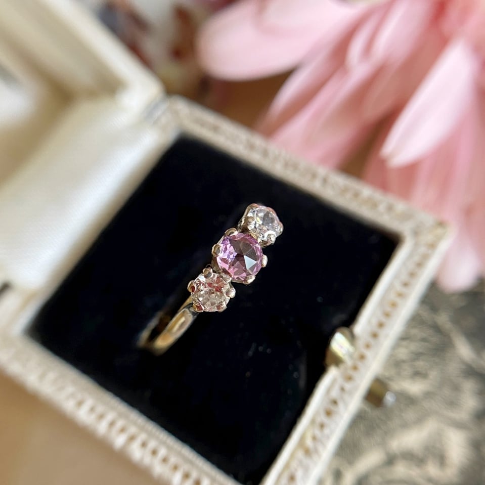 柔らかな色合いのローズカットピンクサファイアを中心にその両隣りにはオールドヨーロピアンカットダイヤモンドを添えたスリーストーンリング。
