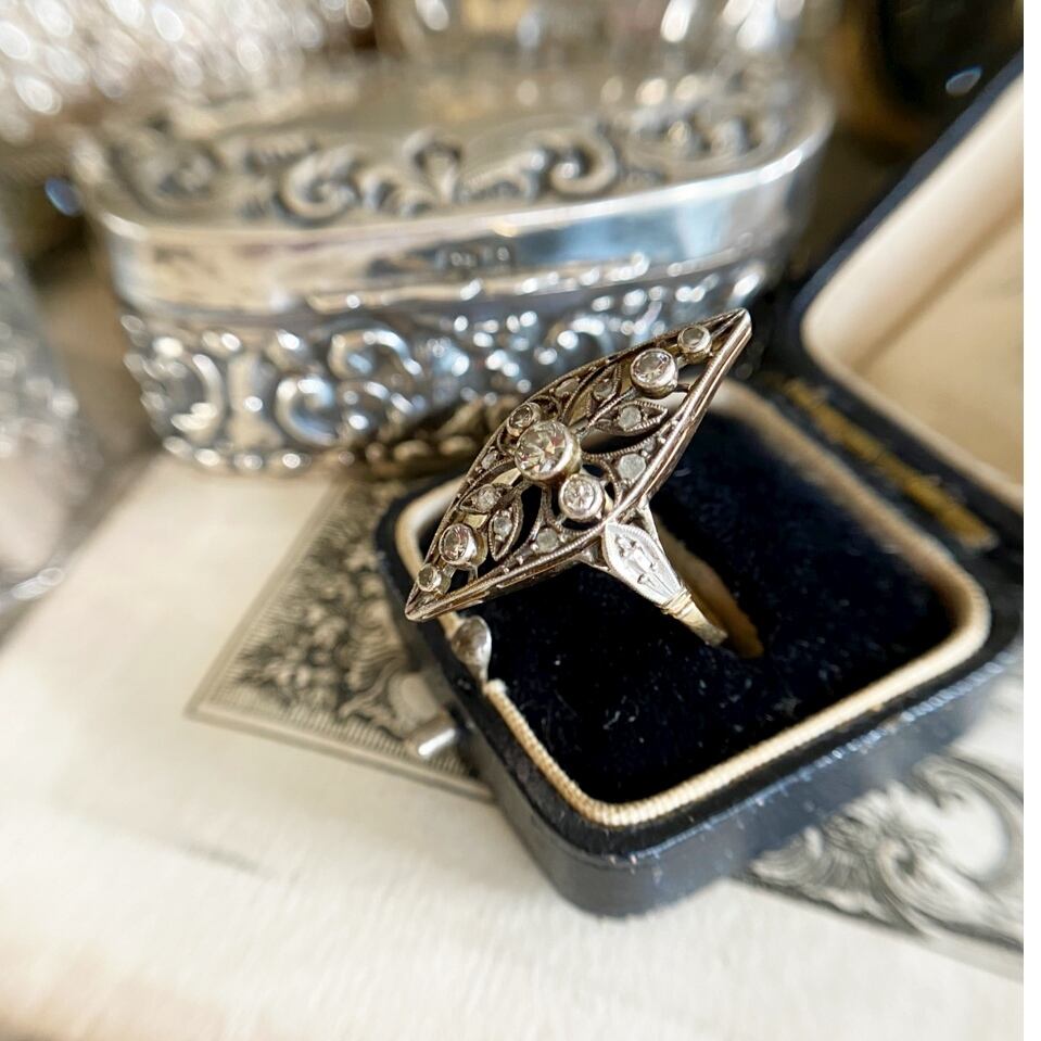 ベルエポックならではの洗練された美しいフォルムは日本的な美しさを感じ、均整がとれたデザイン、柔和ないでたち、アウトラインに打たれたミルグレイン、この時代独特の貴族的な美意識を反映したひと品は、優雅な貴婦人の指先を飾っていたであろうと想像していまう美しいひと品です。