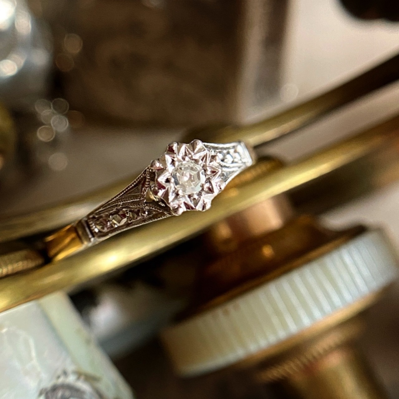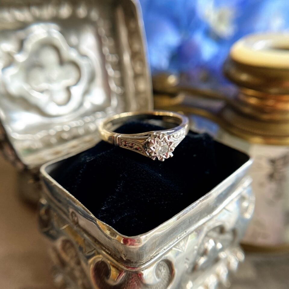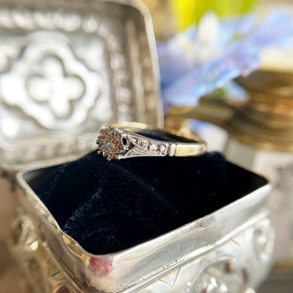 星の輝きを表現したかのような8つの後光を彫金したプラチナの台座の中に小さなシングルカットダイヤモンドがセットされたリング。