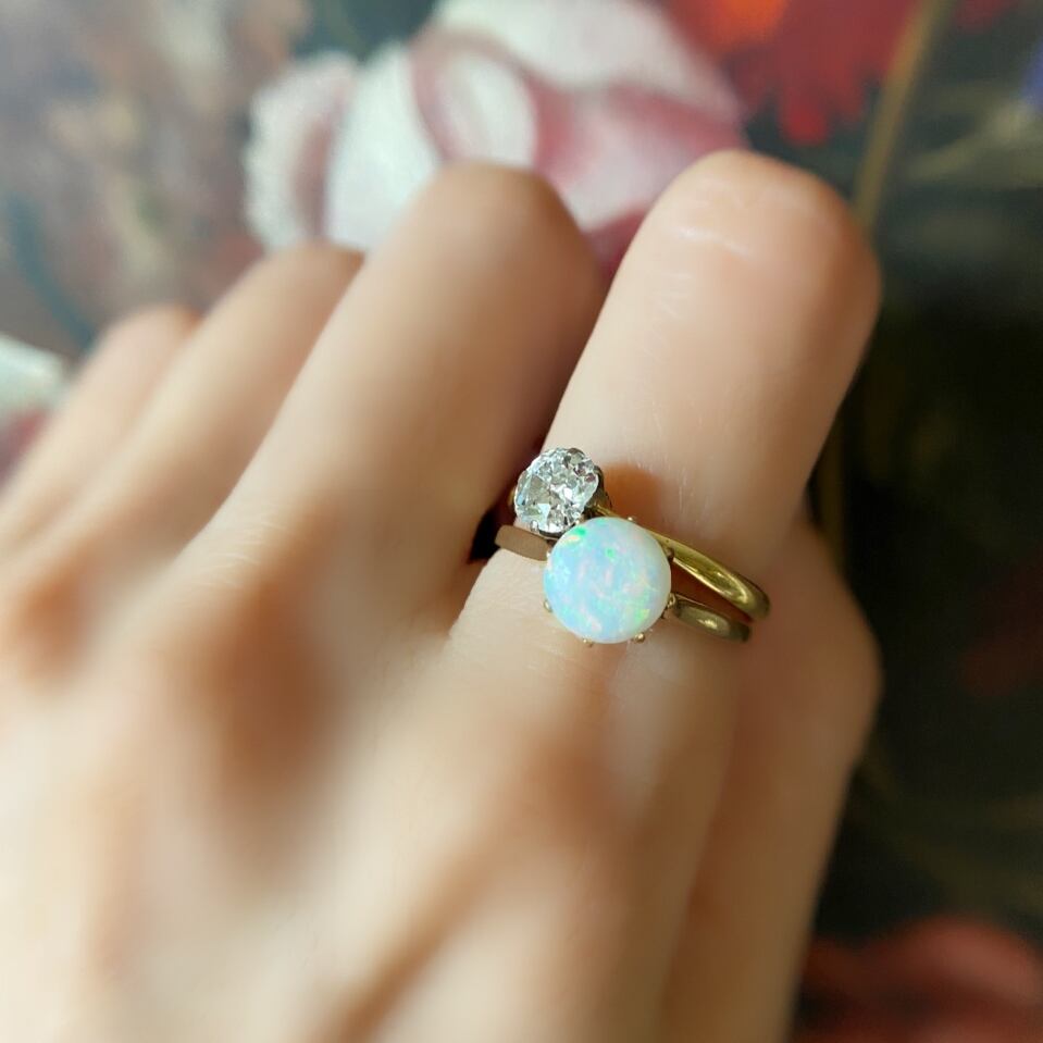 特にヴィクトリア時代に好まれた石でもあるオパールは質上デリケートな石の為アンティークの物になると時の経過分だけ表面が幾分マットで輝きが薄れてしまっている事が多くあります。こちらの石も時代によるマット感が少し見受けられますが、キズやカケはなく、オレンジやグリーン、ブルーのクリーミーな浮遊色を見せてくれます。