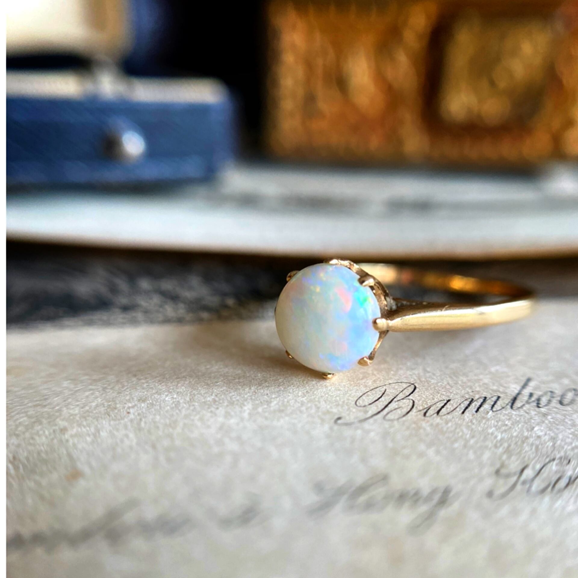 ブルーやグリーンやオレンジの幻想的に煌くオパールだけをセットしたリングは9カラットゴールドの一切装飾のないシンプルで華奢な台座に、まるで宇宙から地球を眺めているかの如く美しく佇んでます。
