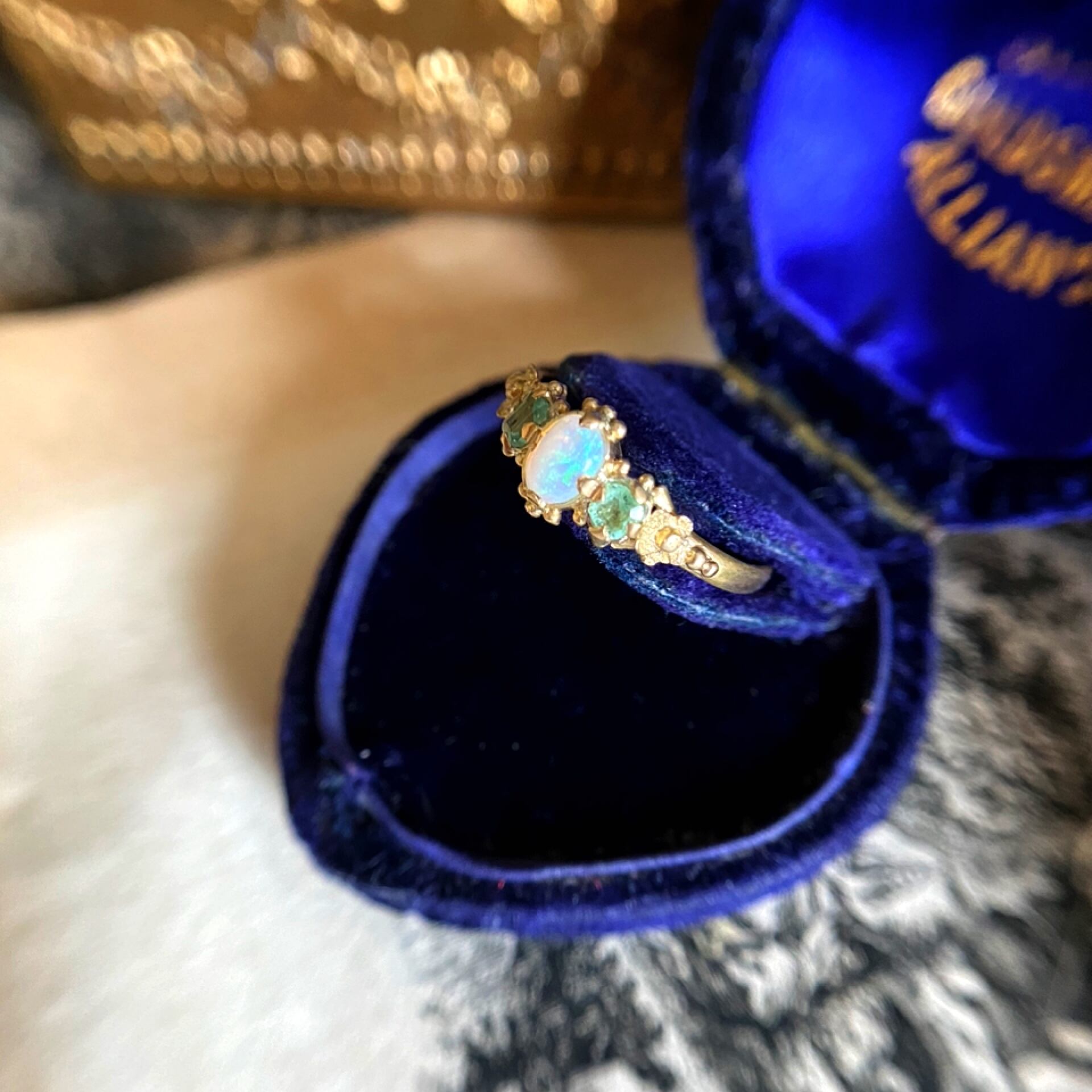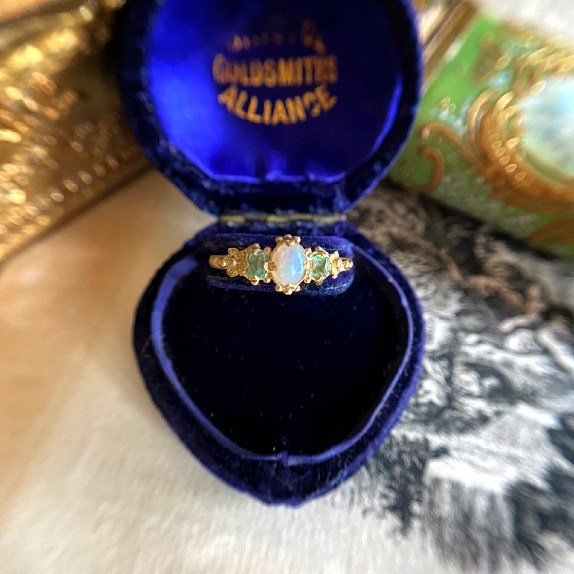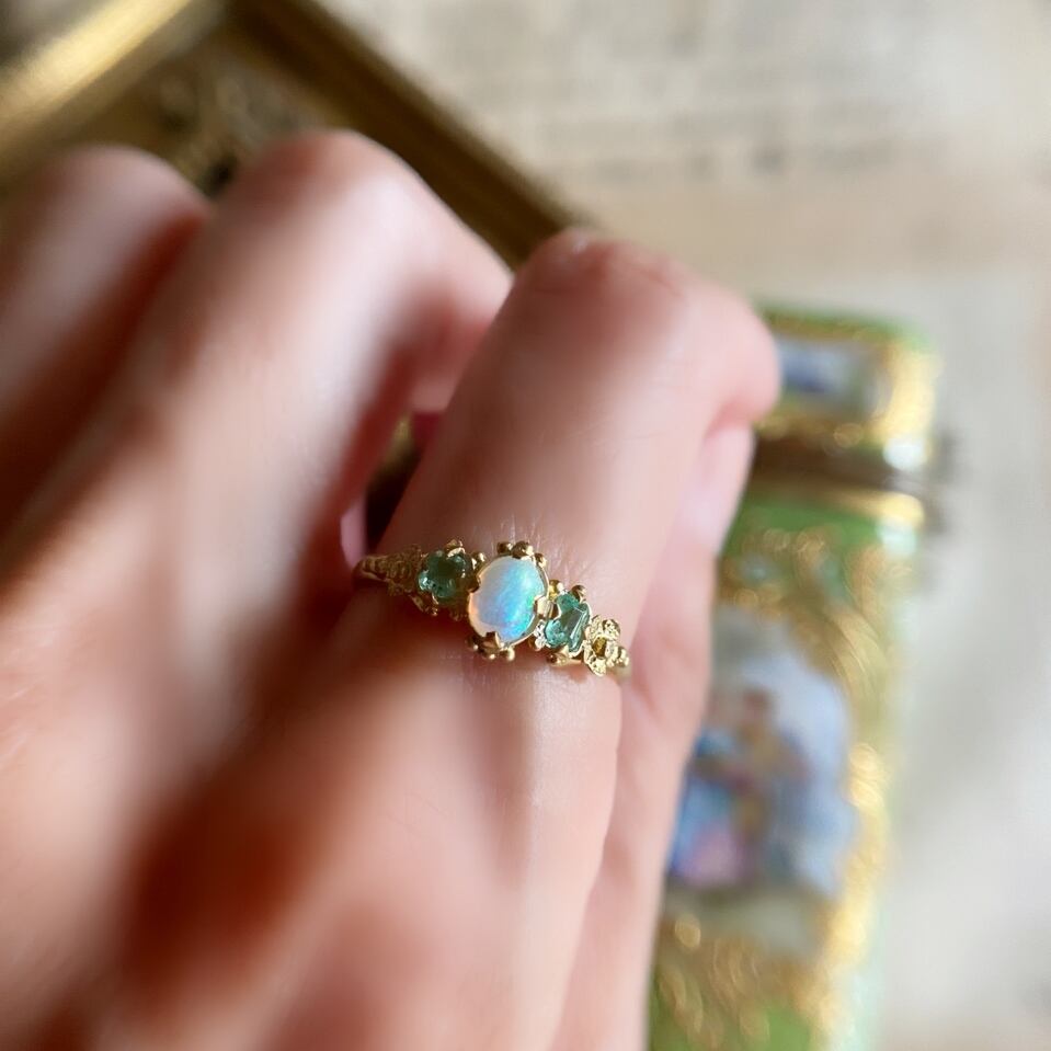 ブルーやグリーンやオレンジの幻想的に煌くオパールをメインに、その両隣には柔らかな透明度の高い