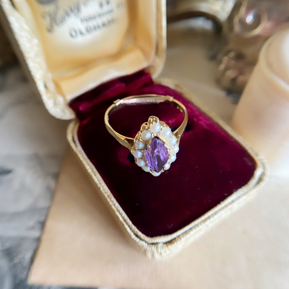 マーキース型のアメシストに添うように一粒一粒セットされています。