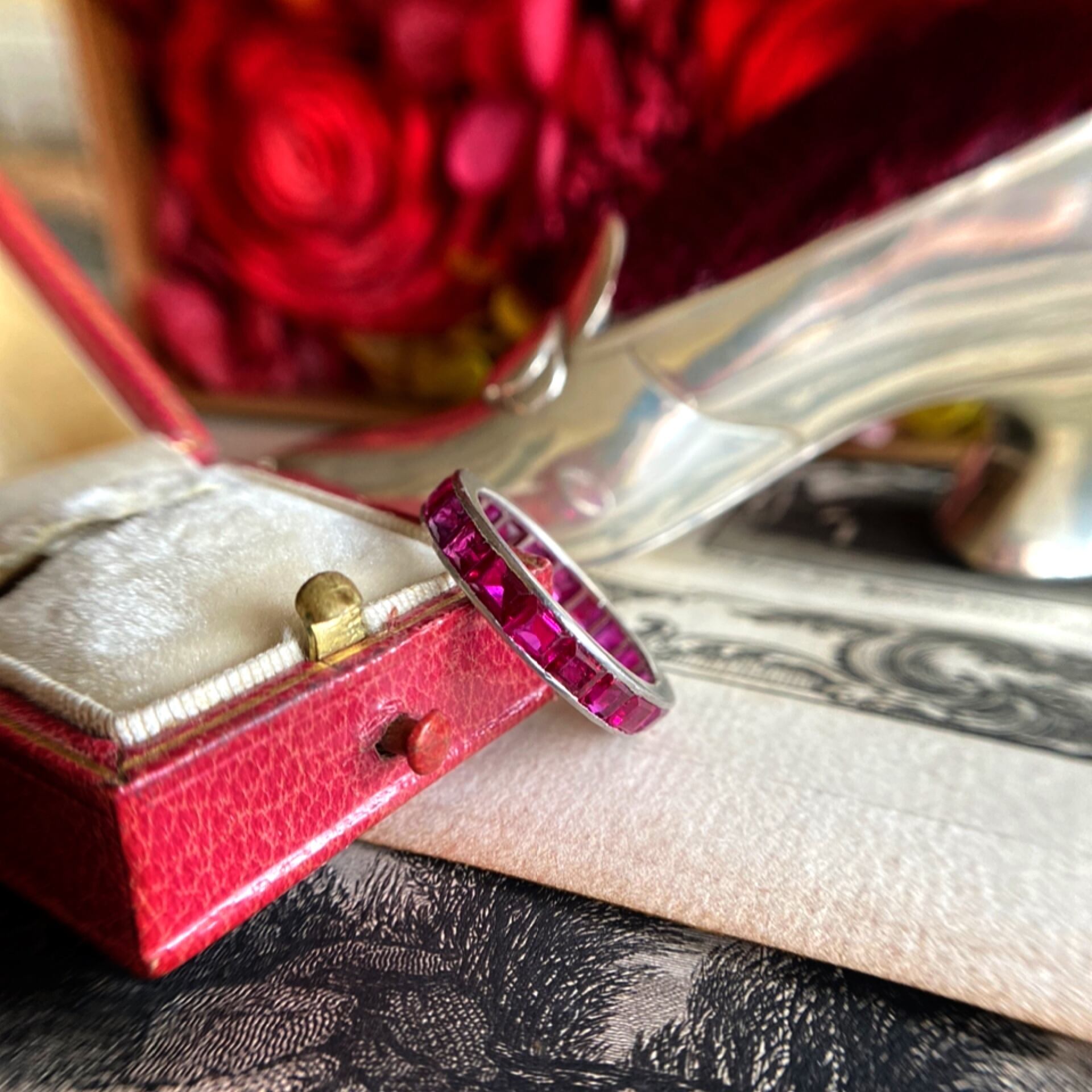 フランボワーズのような透明感のあるピンク味を帯びた炎のような明るい赤色が現れる美しい姿にパッションを感じでしまう程に惚れ惚れしてしまうリングはすっきりとした端正な姿とは裏腹の妖艶な姿にうっとりとしてしまうひと品です。