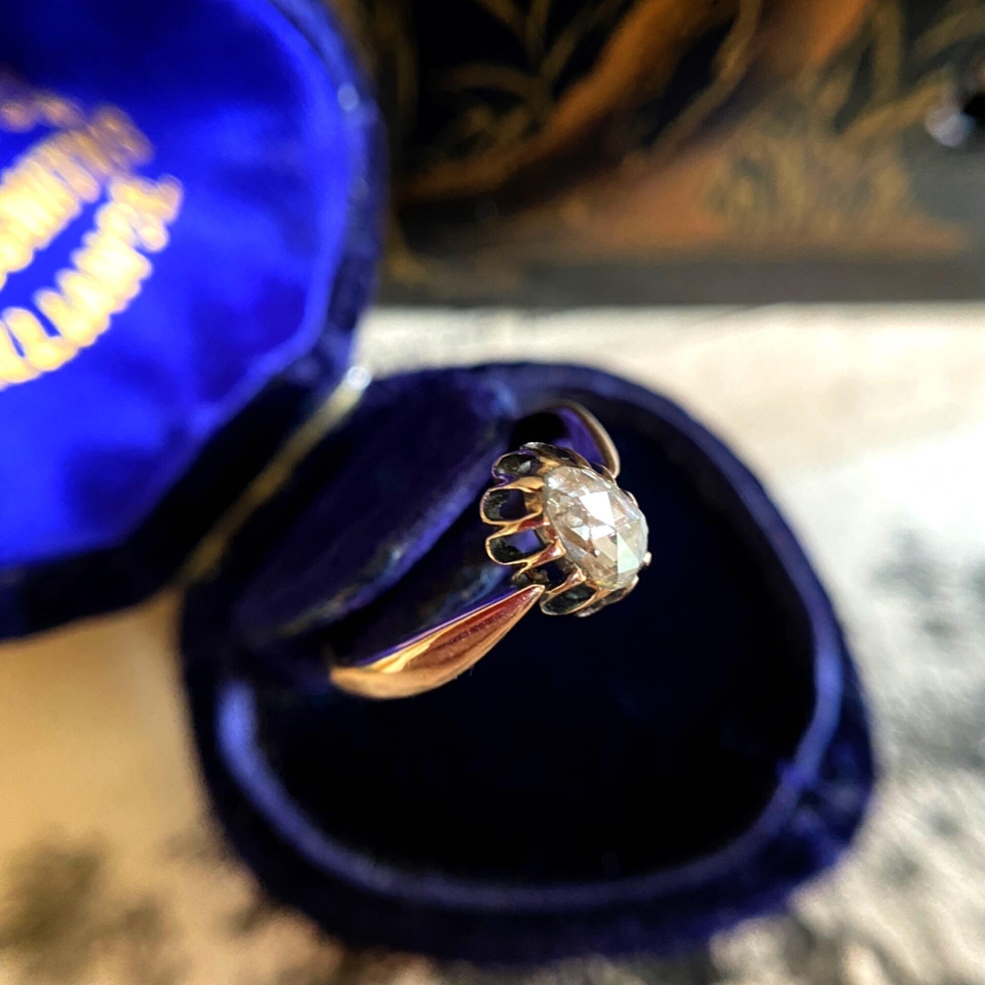 ルーペで覗くとカーボンが見受けられますが、クローズドセッティングの為全く目立たず、アンティークの風情を感じドキッとしてしまうほどに味わい深くそして力強い輝きを見せてくれます。