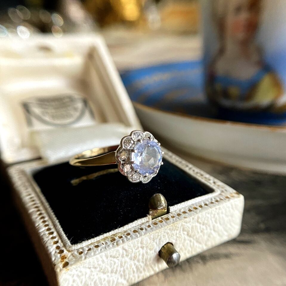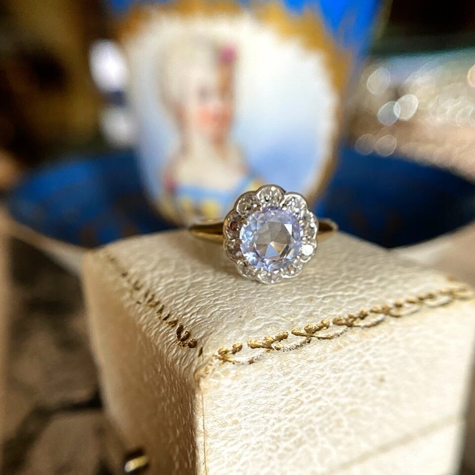 サファイア&オールドヨーロピアンカットダイヤモンドフラワークラスターリング