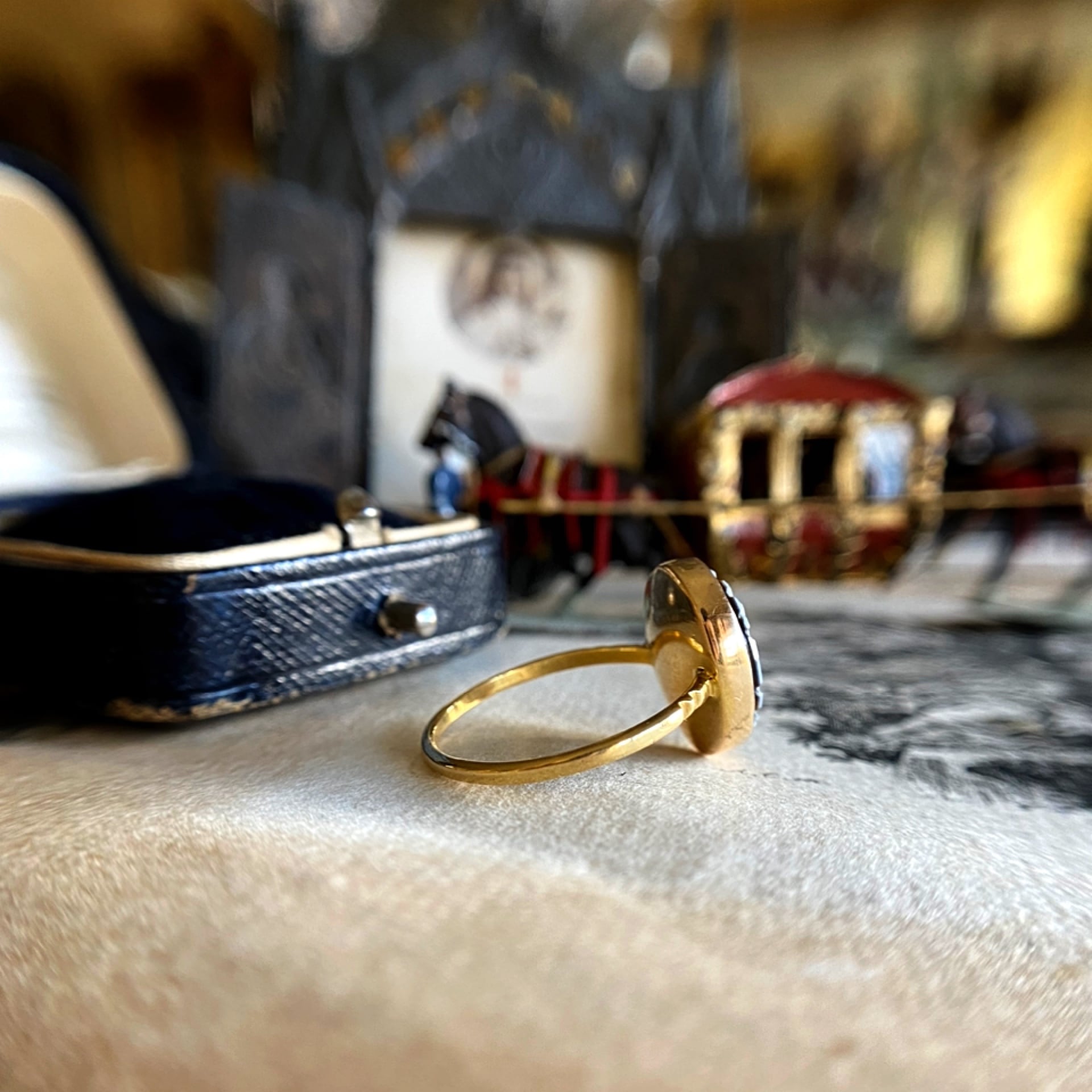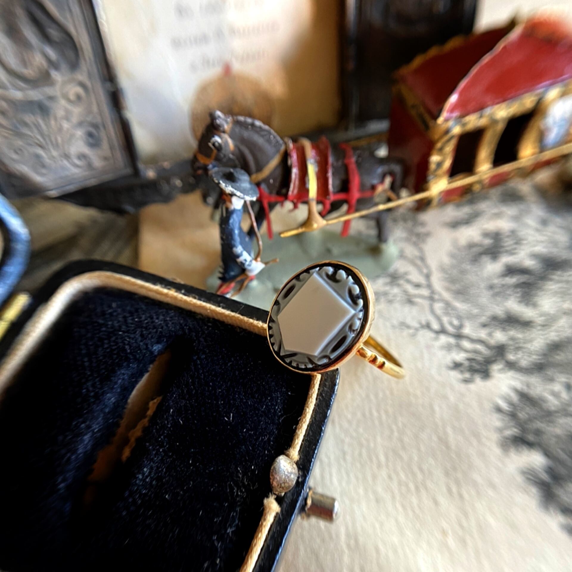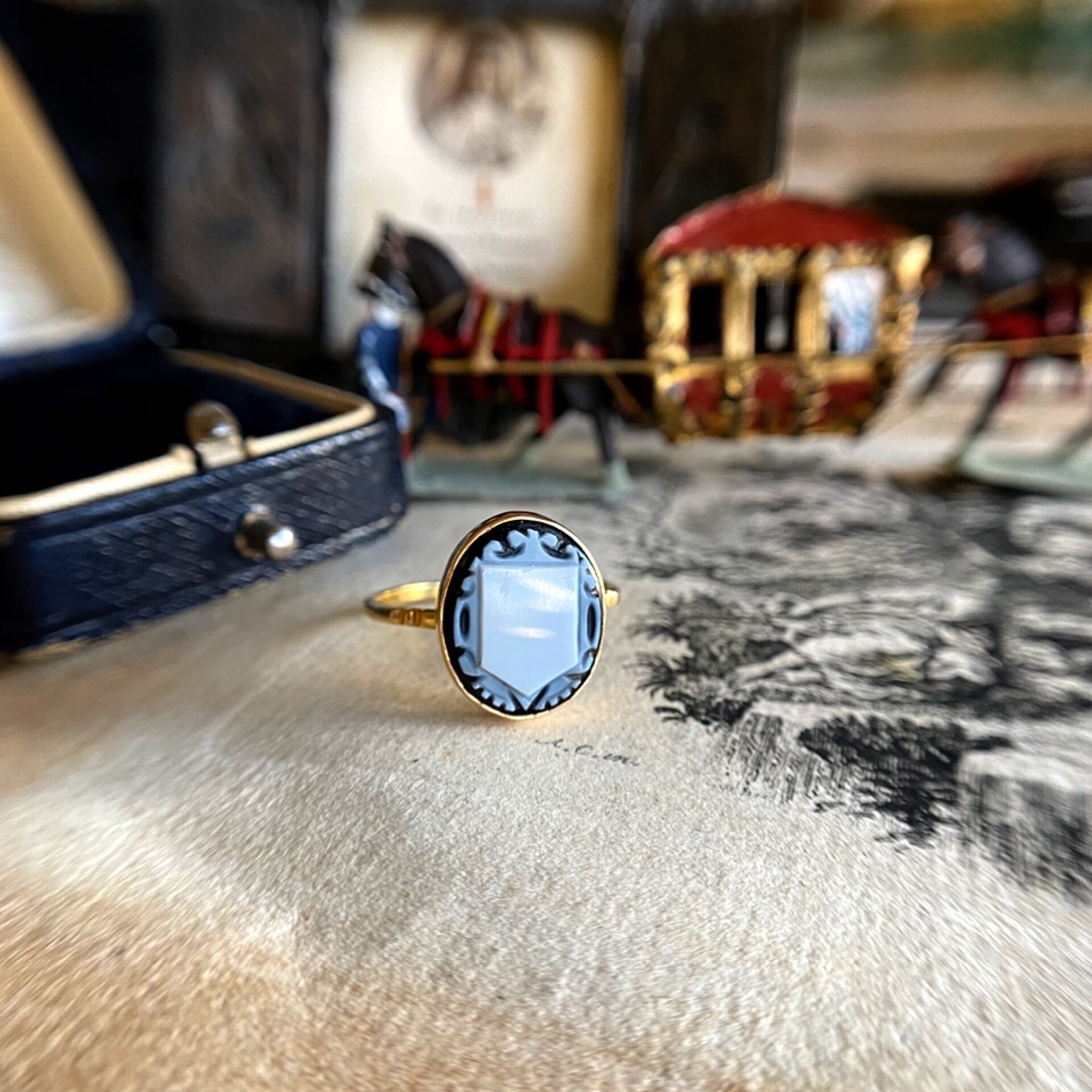 ブラック瑪瑙のホワイト層をカメオ彫して紋章に仕立てたコントラストの美しいリング。