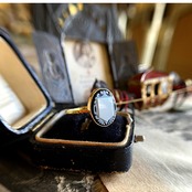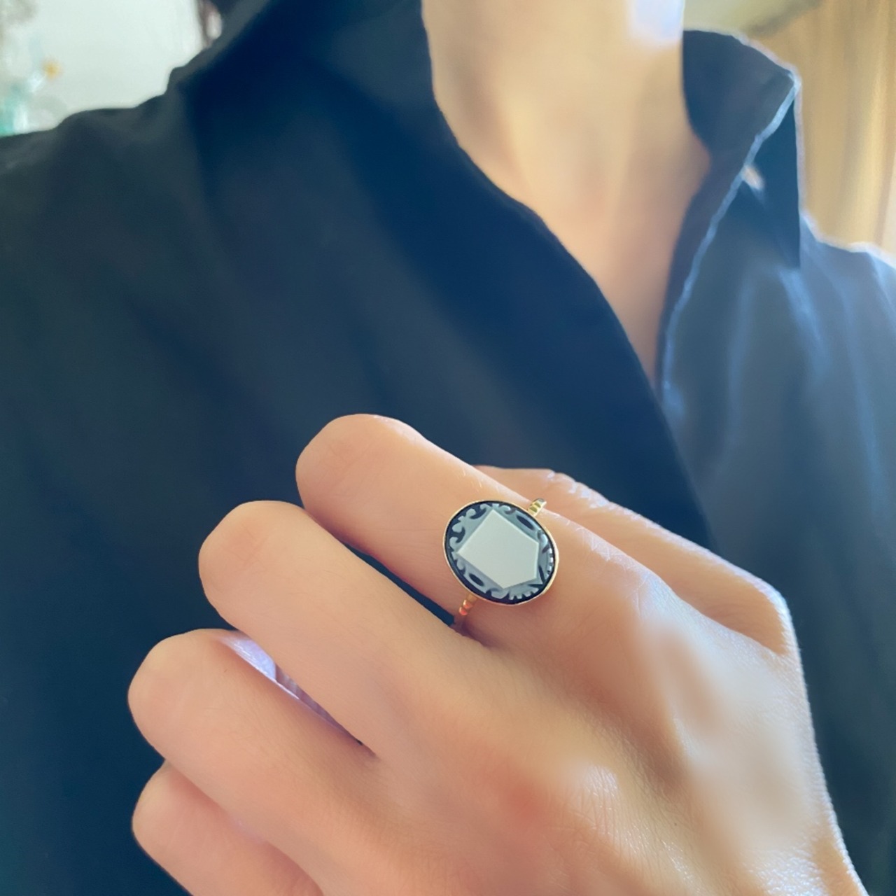 ゴールドの台座にクローズドセッティングですっぽり置かれたアゲートの周りにうっすらとゴールド枠が見え、モノクロのアゲートがくっきりと存在感を示した美しいリングです。