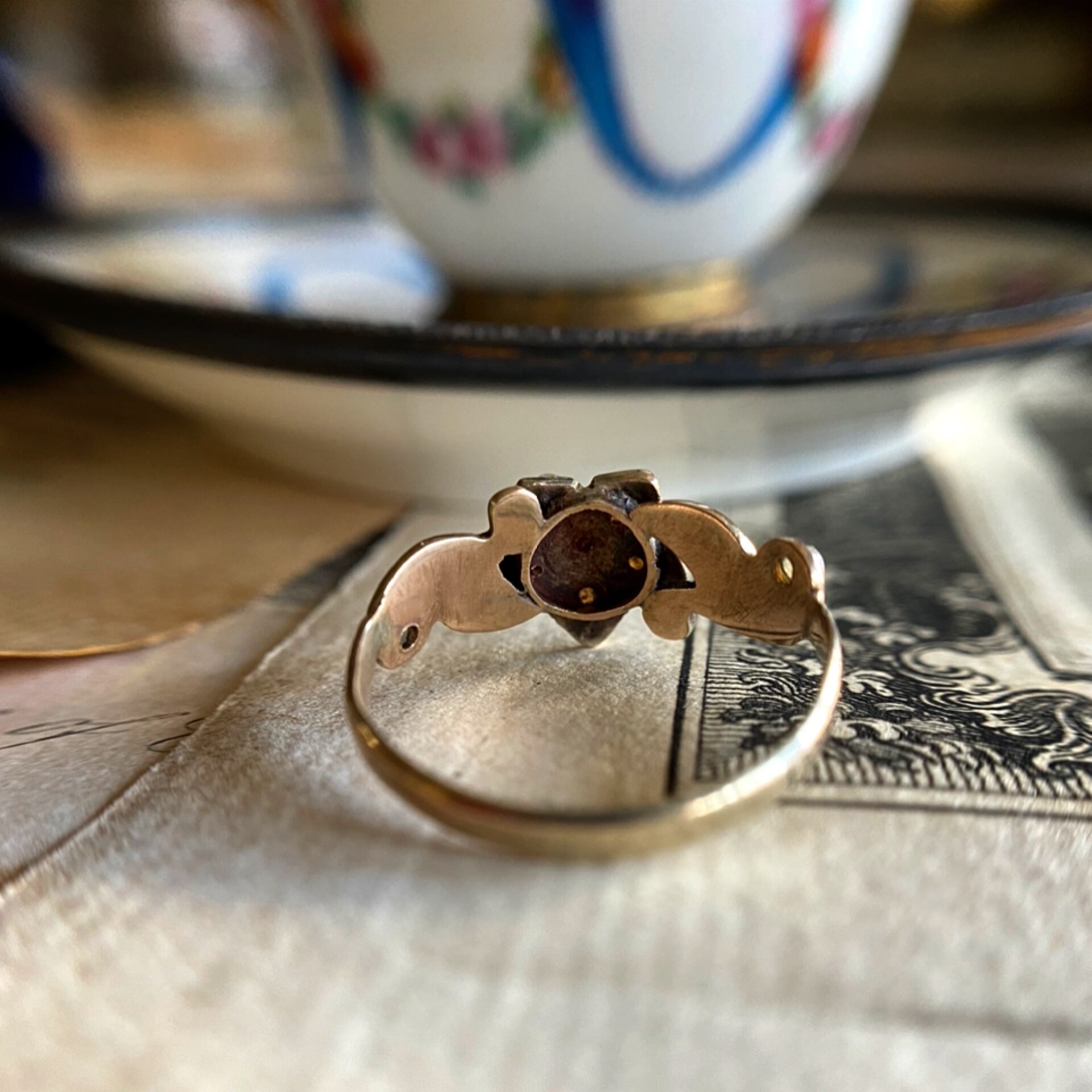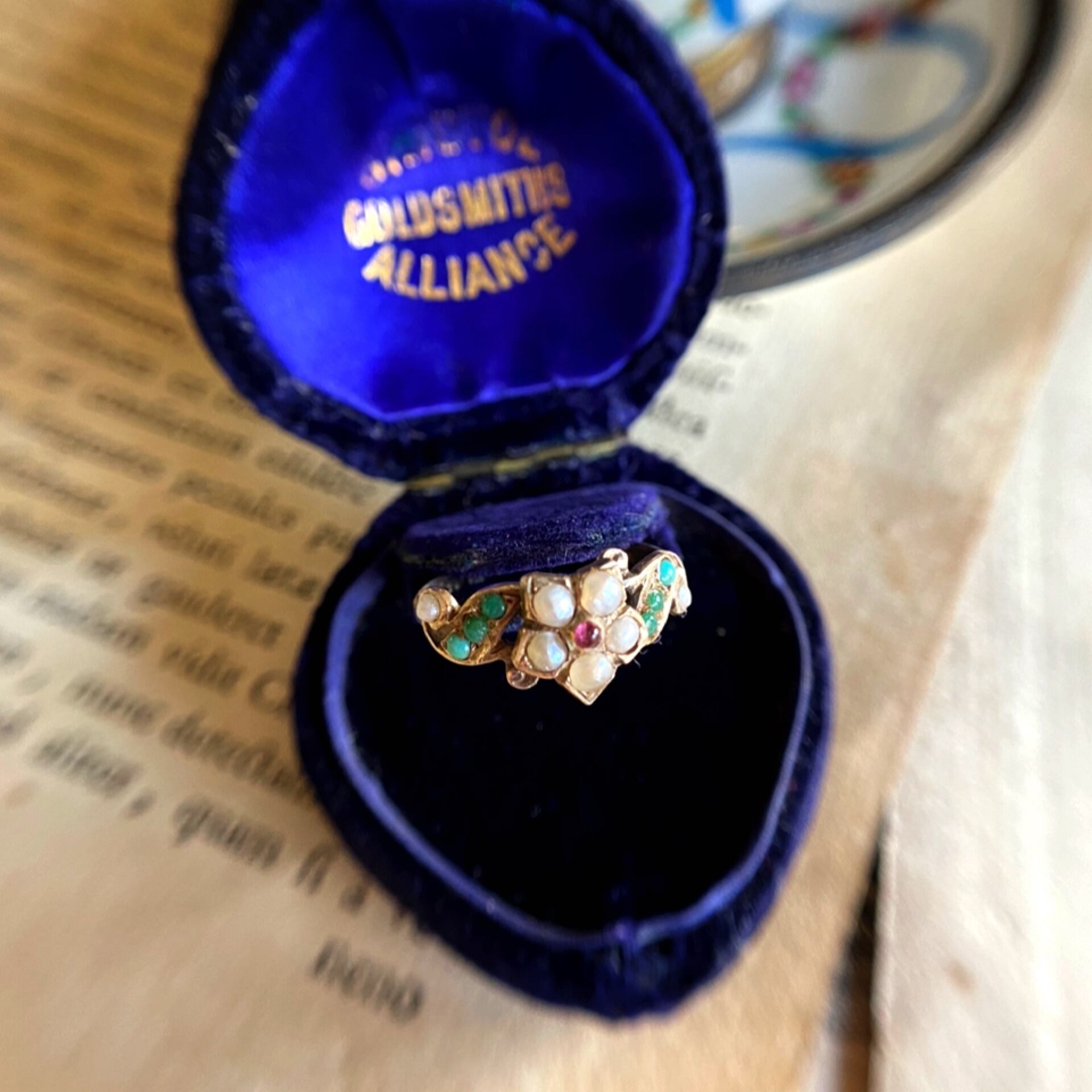 一粒一粒の石は小さいけれども大きな宝石にはないぬくもりとアンティークならではの表情を愉しんで頂ける、愛情表現をリングに込めたロマンス溢れるひと品です。