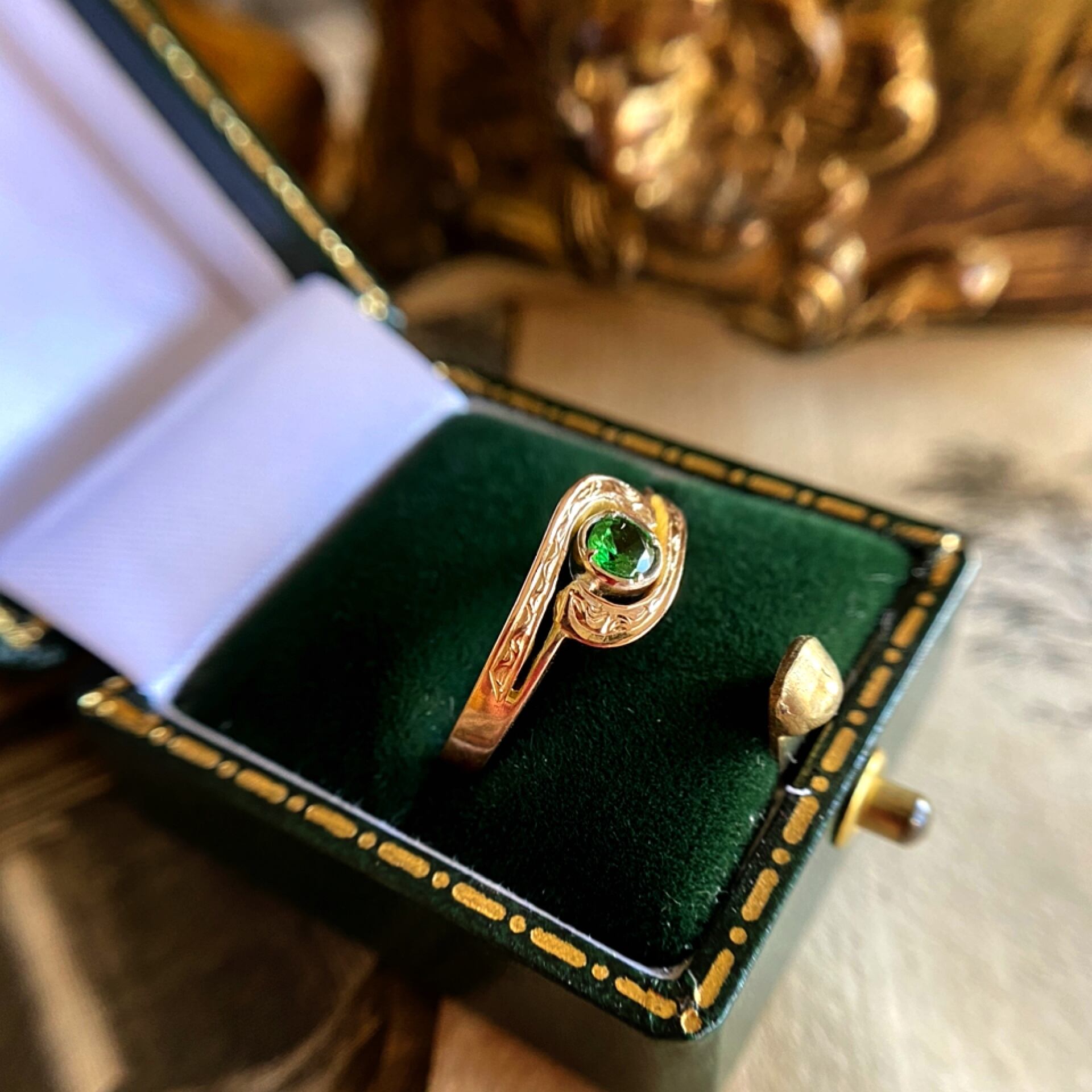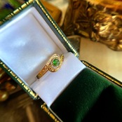 デマントイドガーネットの木漏れ日のような美しい緑色がゴールドの地金に映えるロシアンリング。