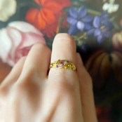 パープリッシュピンクの鮮やかな発色の3石のルビーが目に留まる流れるフォルムが美しいエドワーディアンリング。
