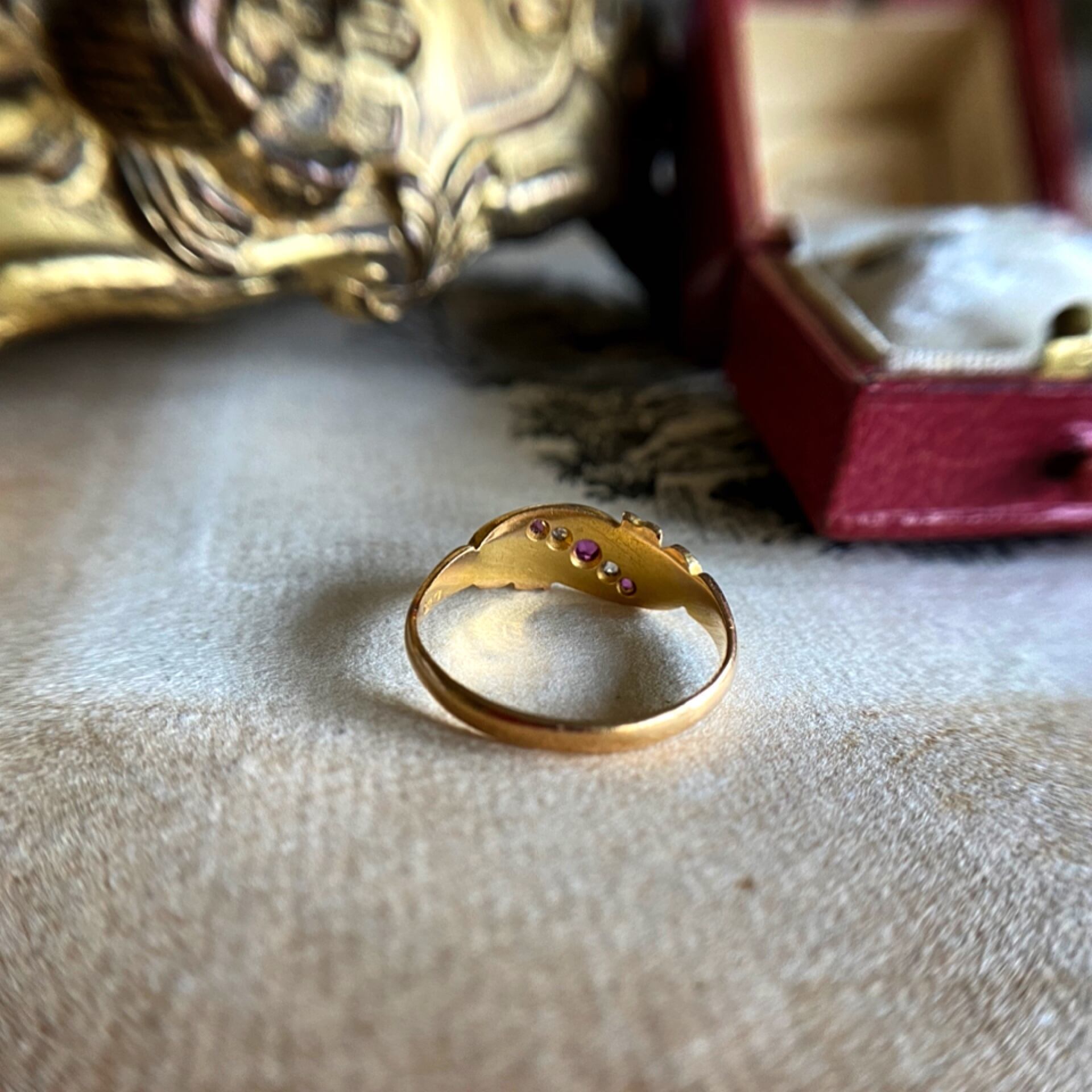 小さいながらもオールドカットダイヤモンドが2石ルビーと交互にセットされ、ルビーの鮮やかな色彩とダイヤモンドの輝きのコントラストを愉しめます。