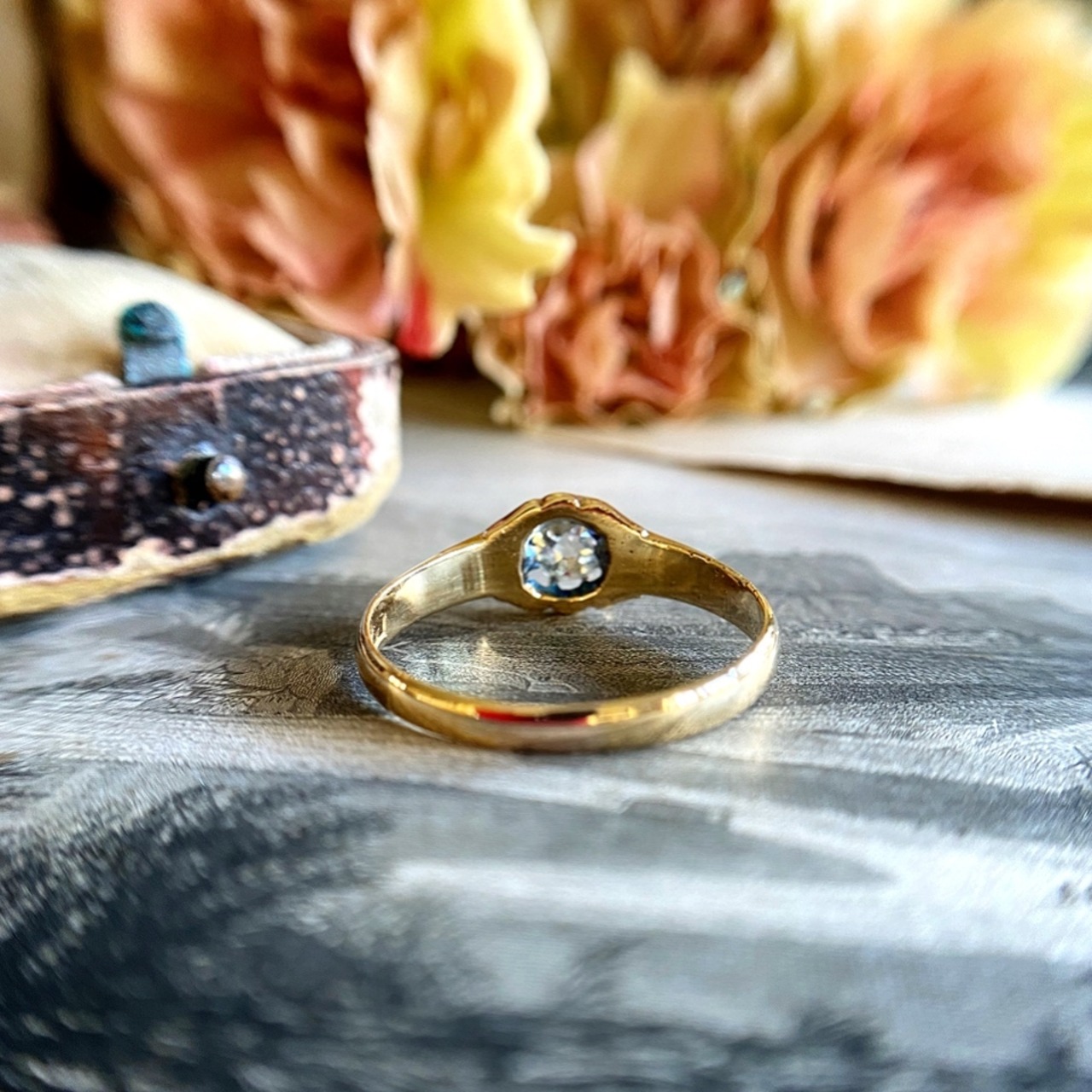 飾り気のないイエローゴールドのシンプルなシャンクとフェイス、そしてその中央に輝くのはたっぷりと5mmのオールドヨーロピアンカットの瑞々しいダイヤモンドが凛と光る美しいリング。
