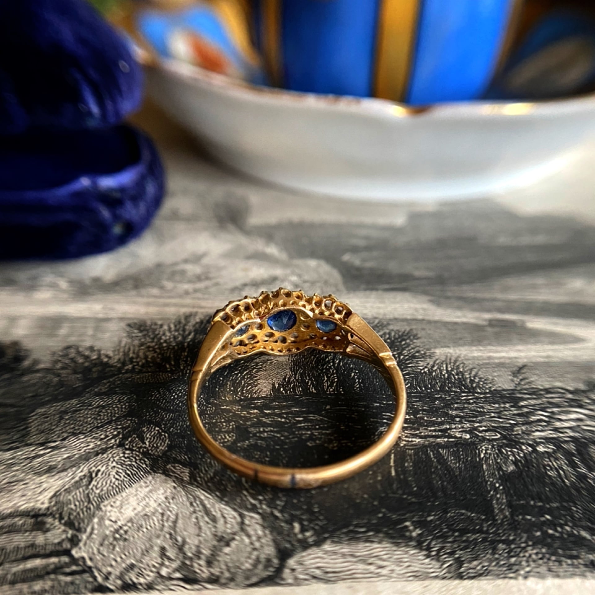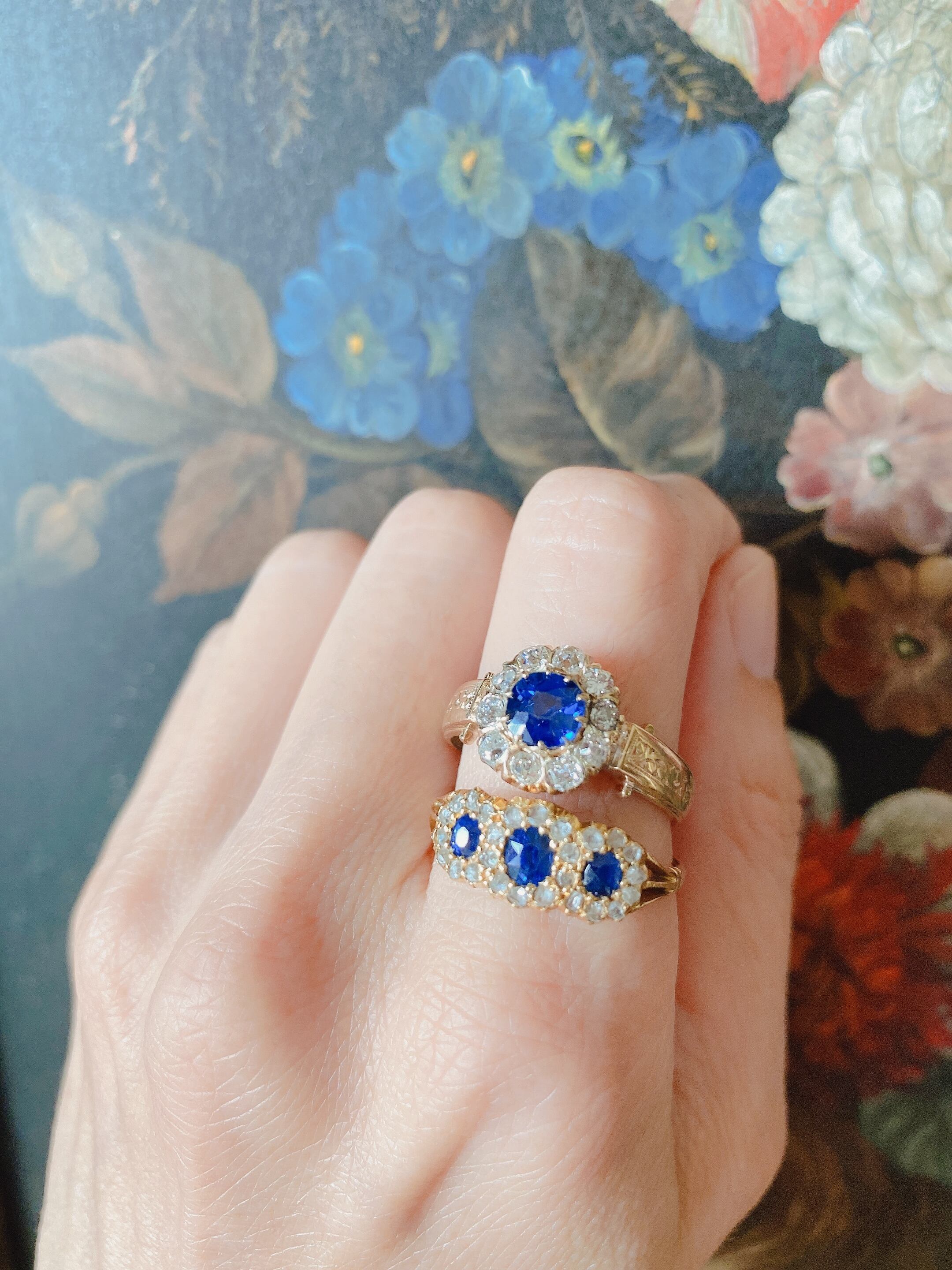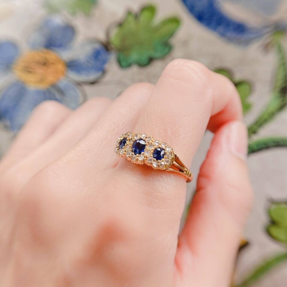 花芯の部分には透明感のある深いブルー色のクションカットサファイアを配し、その周りにはわずか1.5mmほどのハンドカットならではのシャープなローズカットダイヤモンドが散りばめられ、お花に落ちた朝露に太陽があたり輝くような存在で優しく光る姿にこちらのリングの時代の経過を感じる事ができ、いにしえの深みををひっそりと感じる事ができる可愛らしいけど大人な女性の雰囲気のあるリングです。