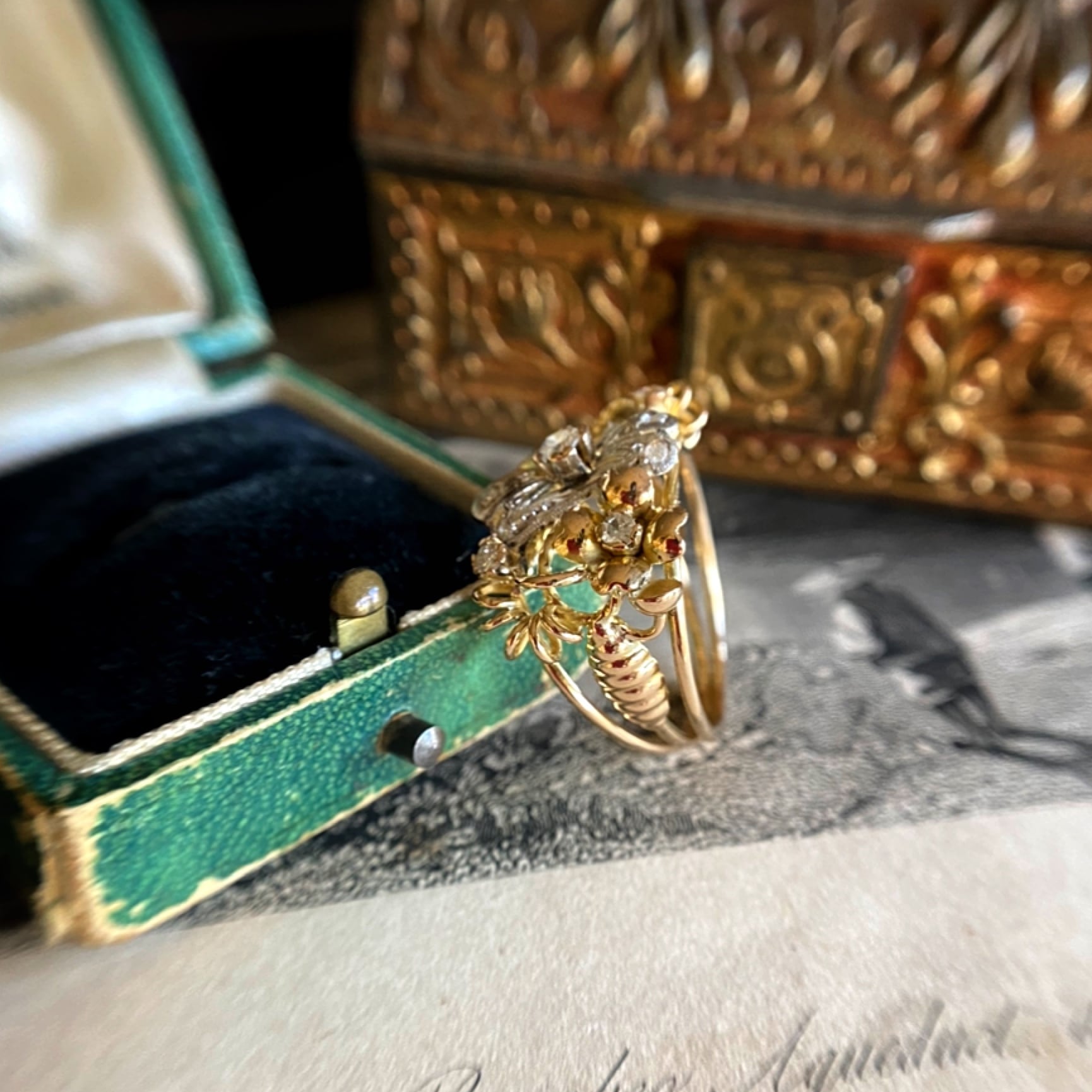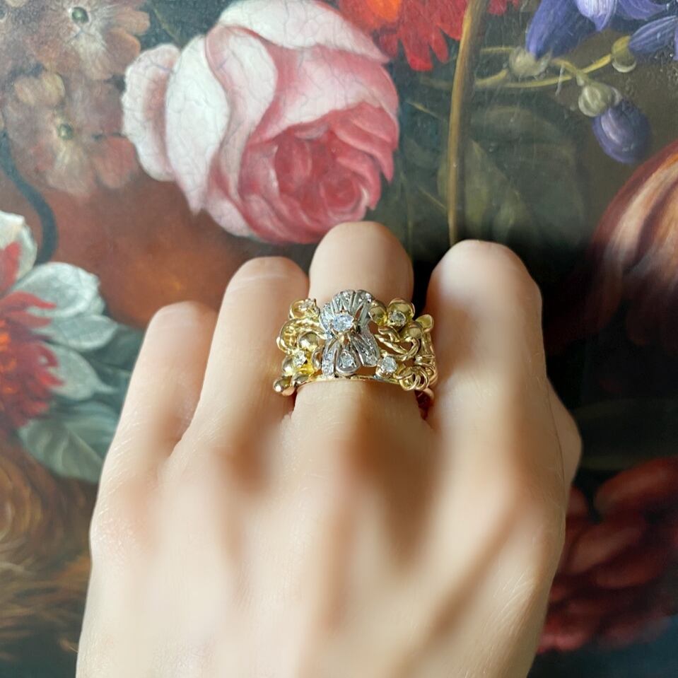 大ぶりなリングですが、ゴールドワイヤーワークの作りになっているため、軽やかで春の訪れのような明るい気持ちになれるリングです。