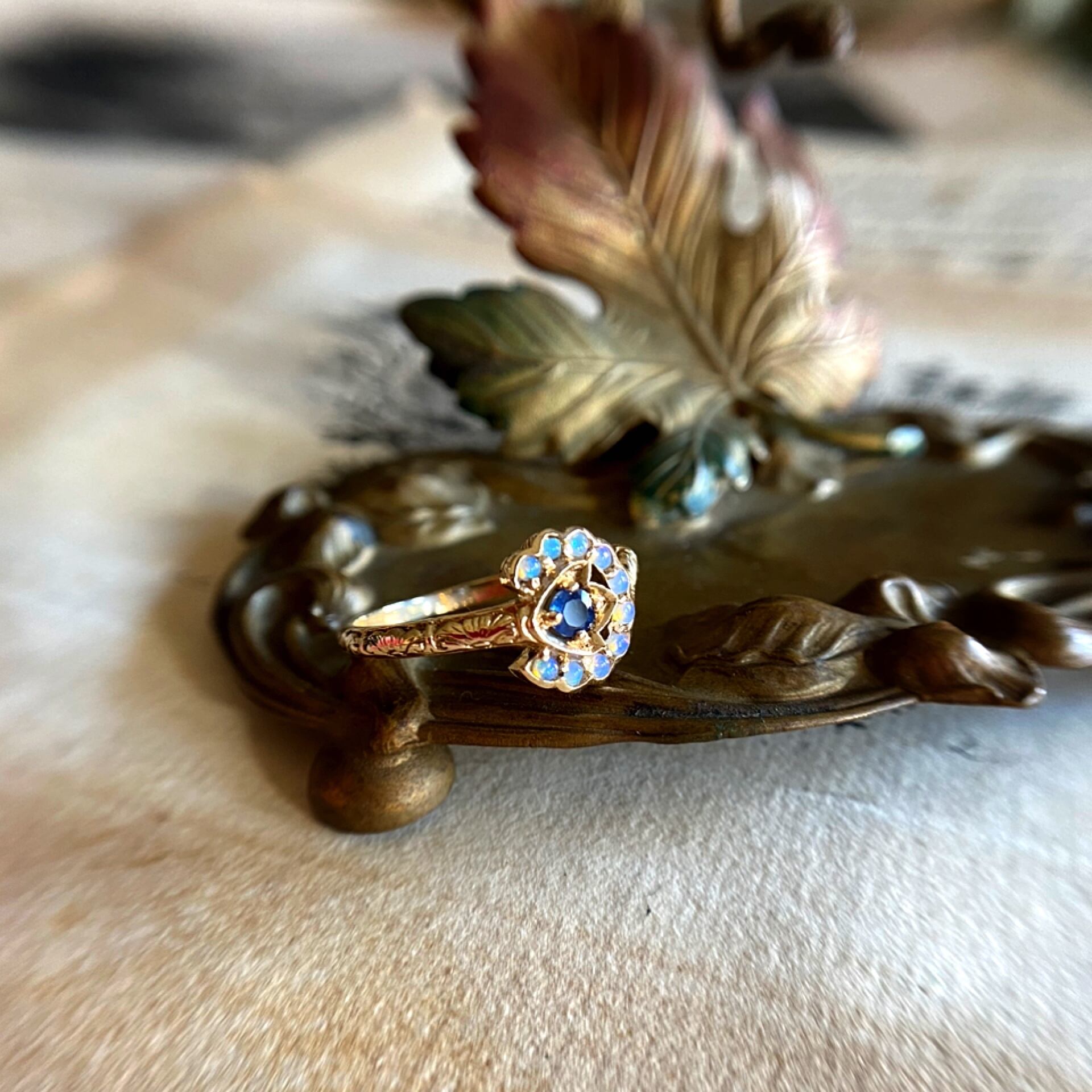 その周りのクレッセントシェープの台座には神秘な石のオパールがセットされたなんともエキゾチックなリング。