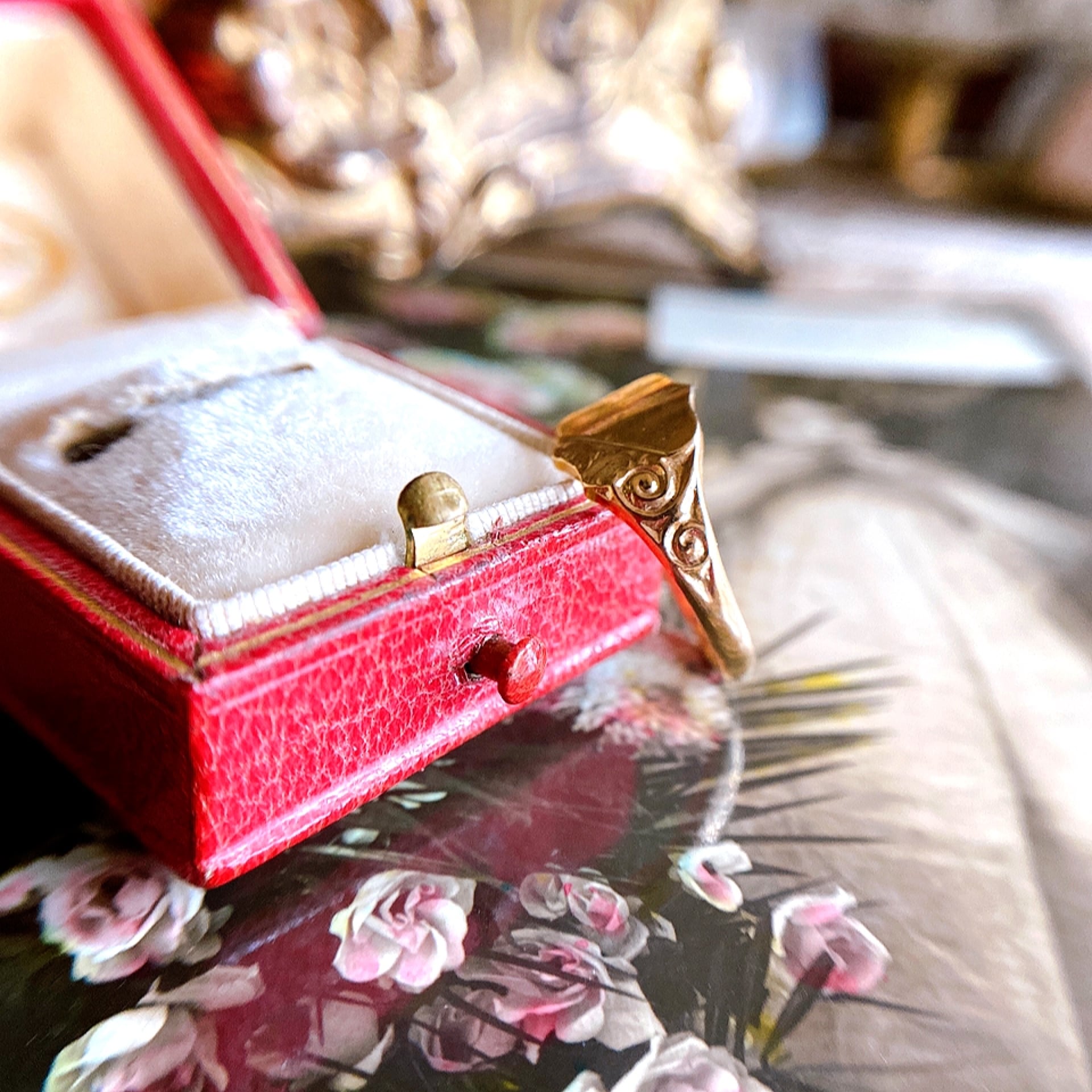 通常のシグネットリングはトップにイニシャルやファミリークレストの彫金がされているだけですが、こちらのリングはモノグラムが入っていませんが、フェイスの1/3からショルダーにかけて唐草模様の彫金がデザインさ、フラットでスベスベした艶やかなゴールドが美しく、落ち着きのある雰囲気が素敵なひと品です。