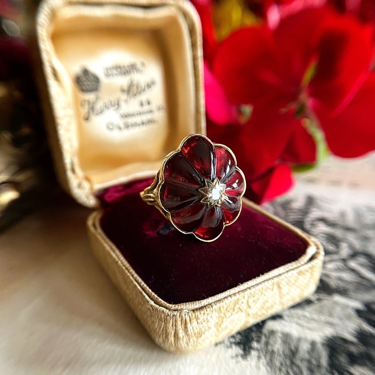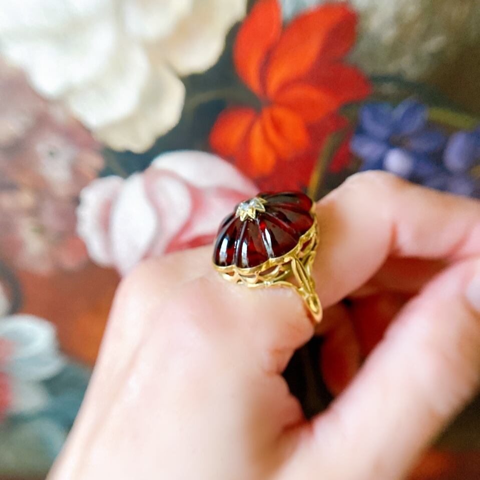 まるで柘榴の実を集めたようなガーネット(柘榴石)の見事なリング。