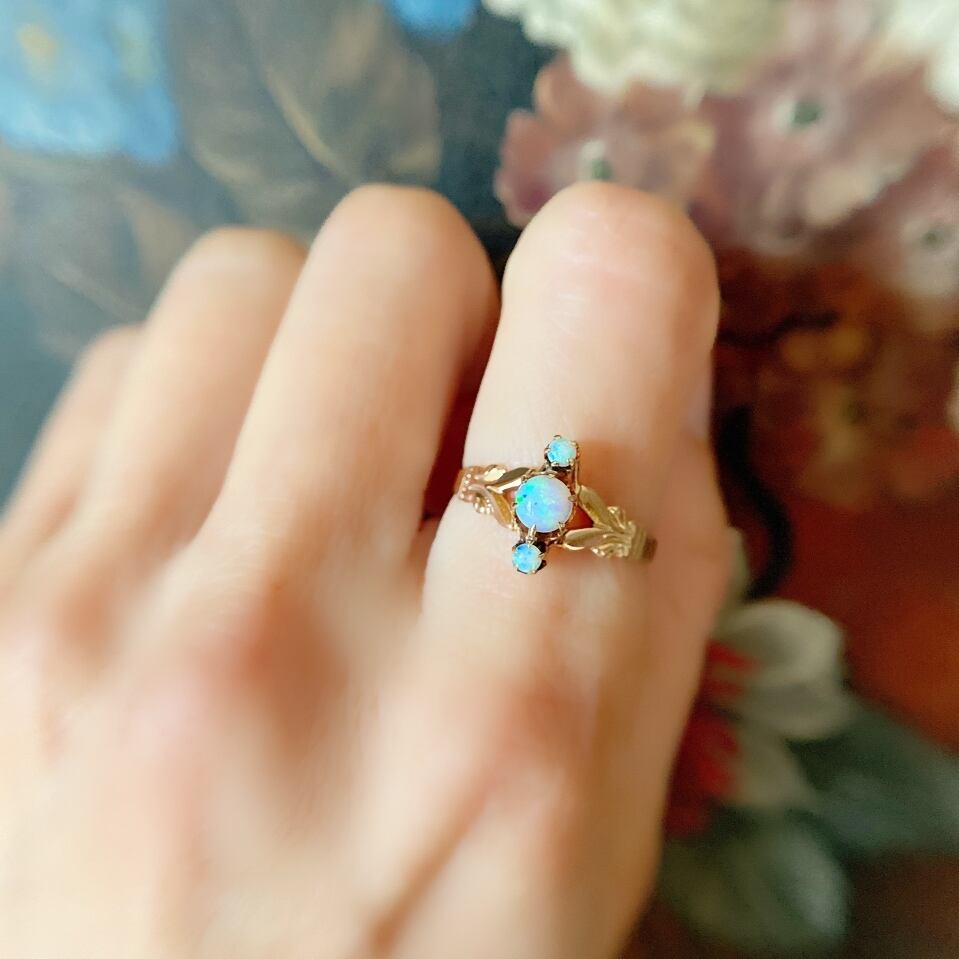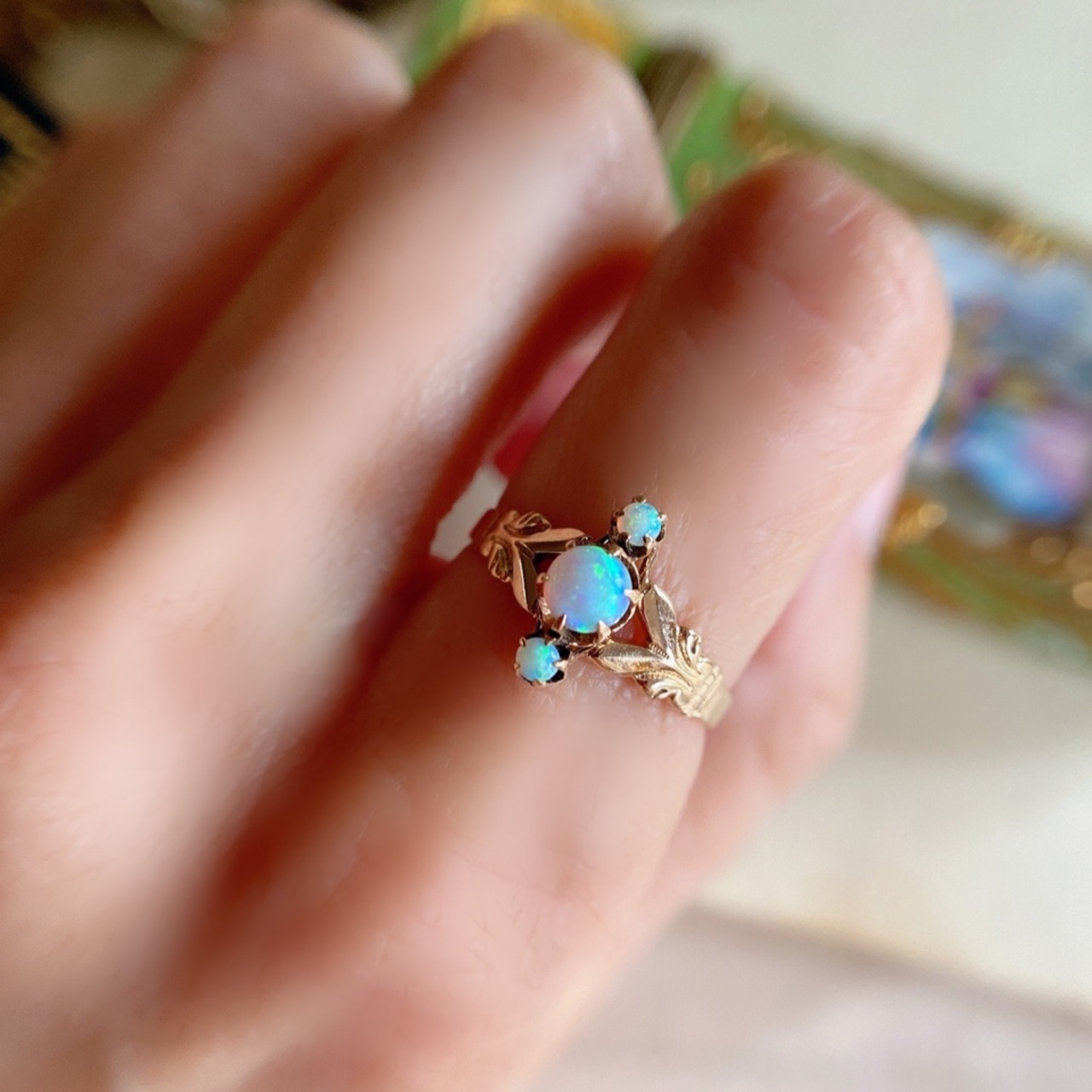 微妙な角度によって見せるいくつもの異なる表情はドキっとするほど美しいオパールスリーストーンヴィクトリアンリング。