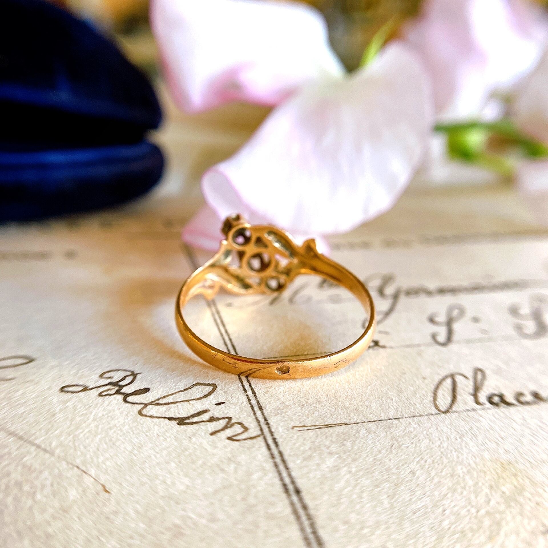 斜めの星型の台座にシードパールを3石並べ、可憐な小花が咲きこぼれるような、愛らしいリングはフランス(フランスの18kを表すイーグルヘッドの刻印)からやってきました。