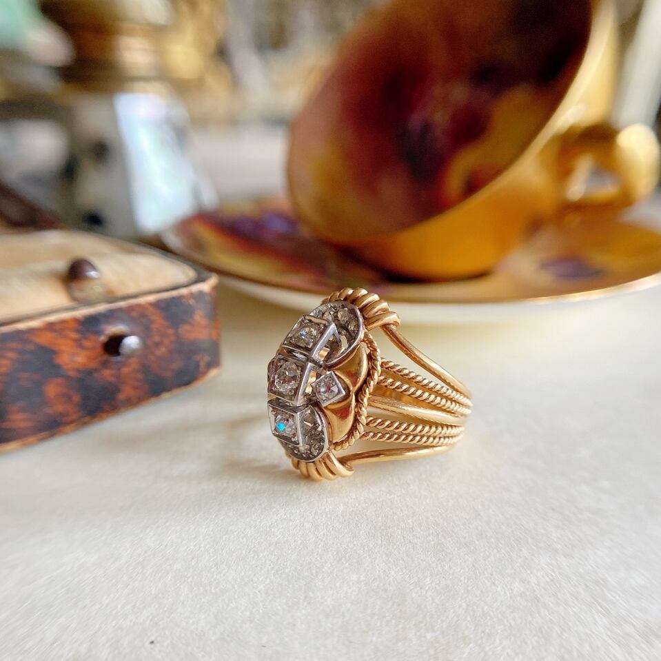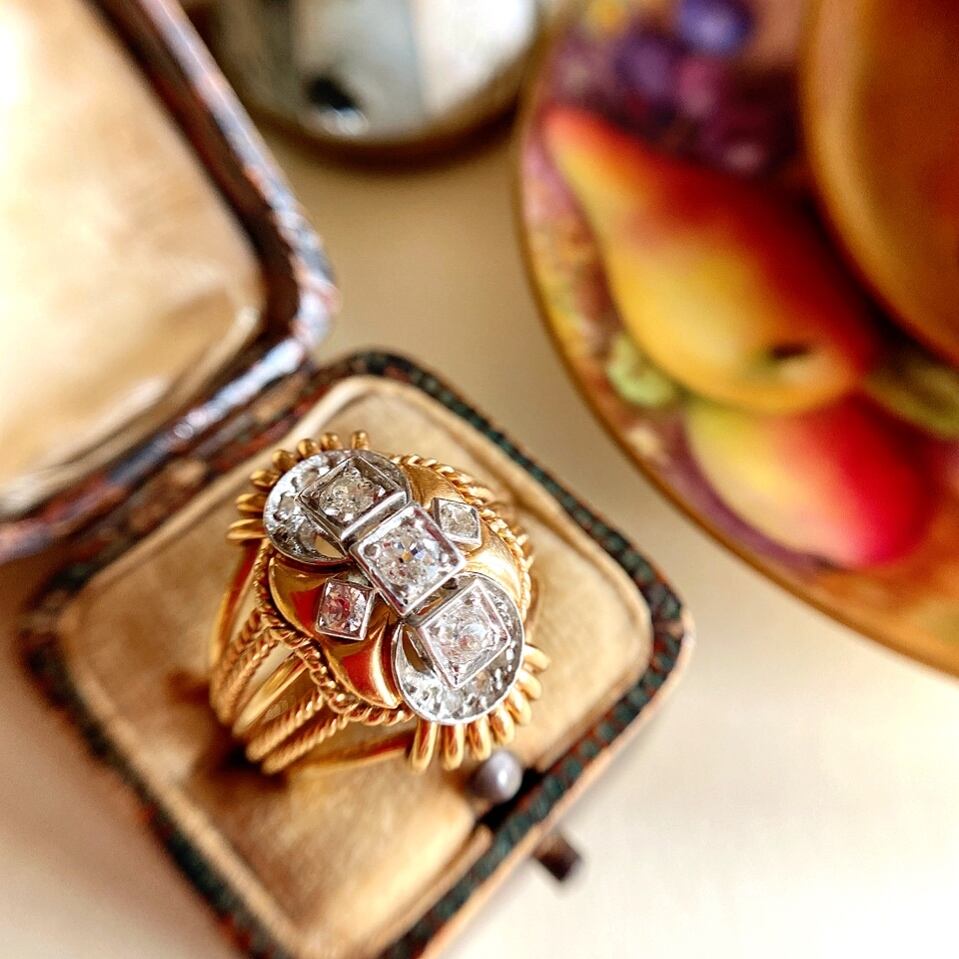 半球状のコロンと盛り上がったデザインで、中央には瑞々しいオールドヨーロピアンカットダイヤモンドがプラチナのスクエアの台座に3石セットされその周りのサークルの台座には小さなローズカットダイヤモンド、そして小さなスクエアの台座には小さなオールドヨーロピアンカットダイヤモンドがセットされ、なんとも斬新なデザインがカッコ良いボリューミーな1940年代頃のリングです。