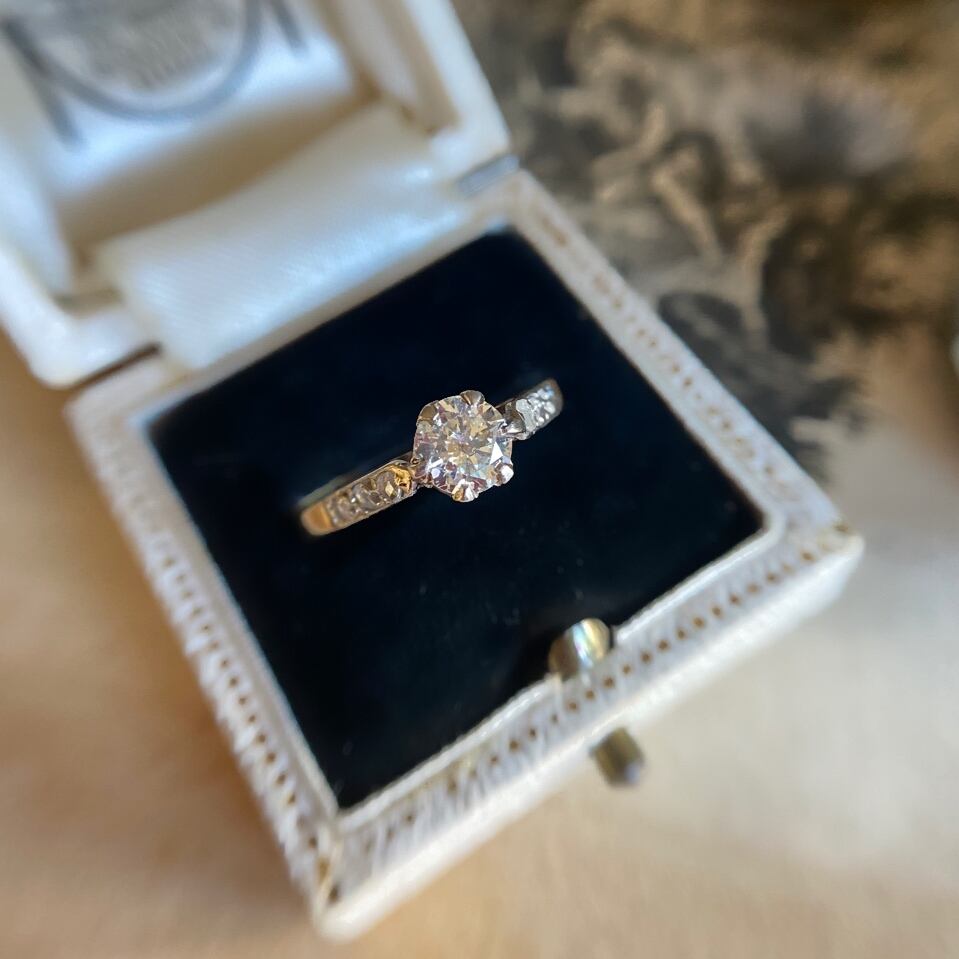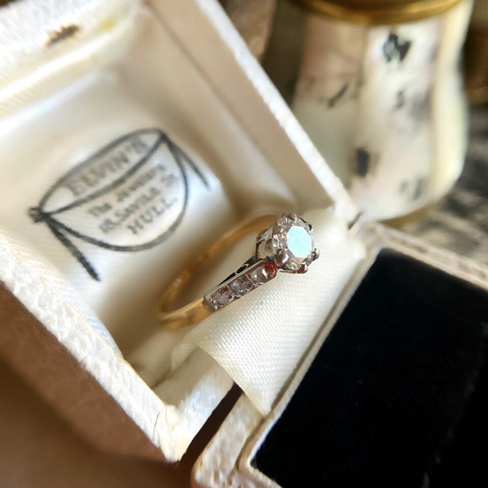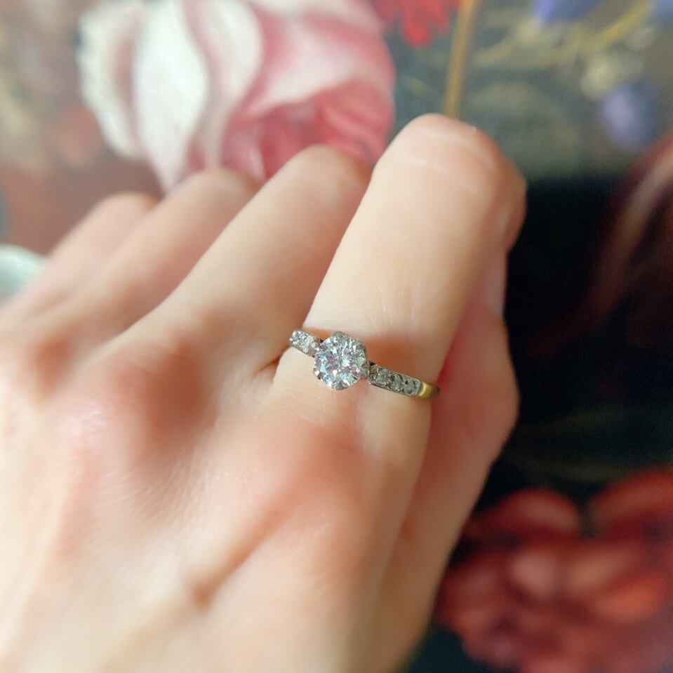 ダイヤモンドをセットしている台座はプラチナ、まるで王冠のようなシルエットのショルダー部分は小さなローズカットダイヤモンドが3石づつセットされ、慎ましく優しく輝いています。