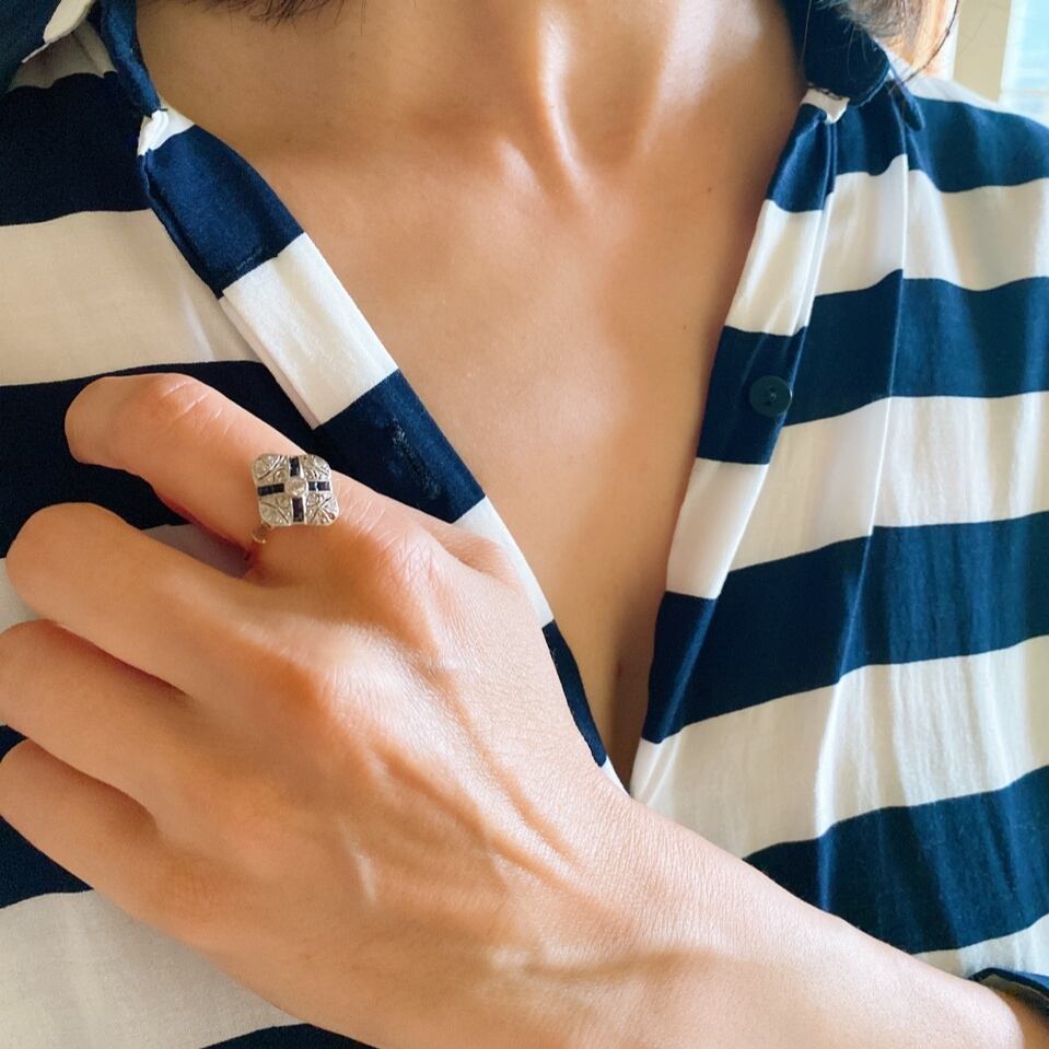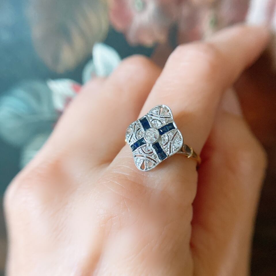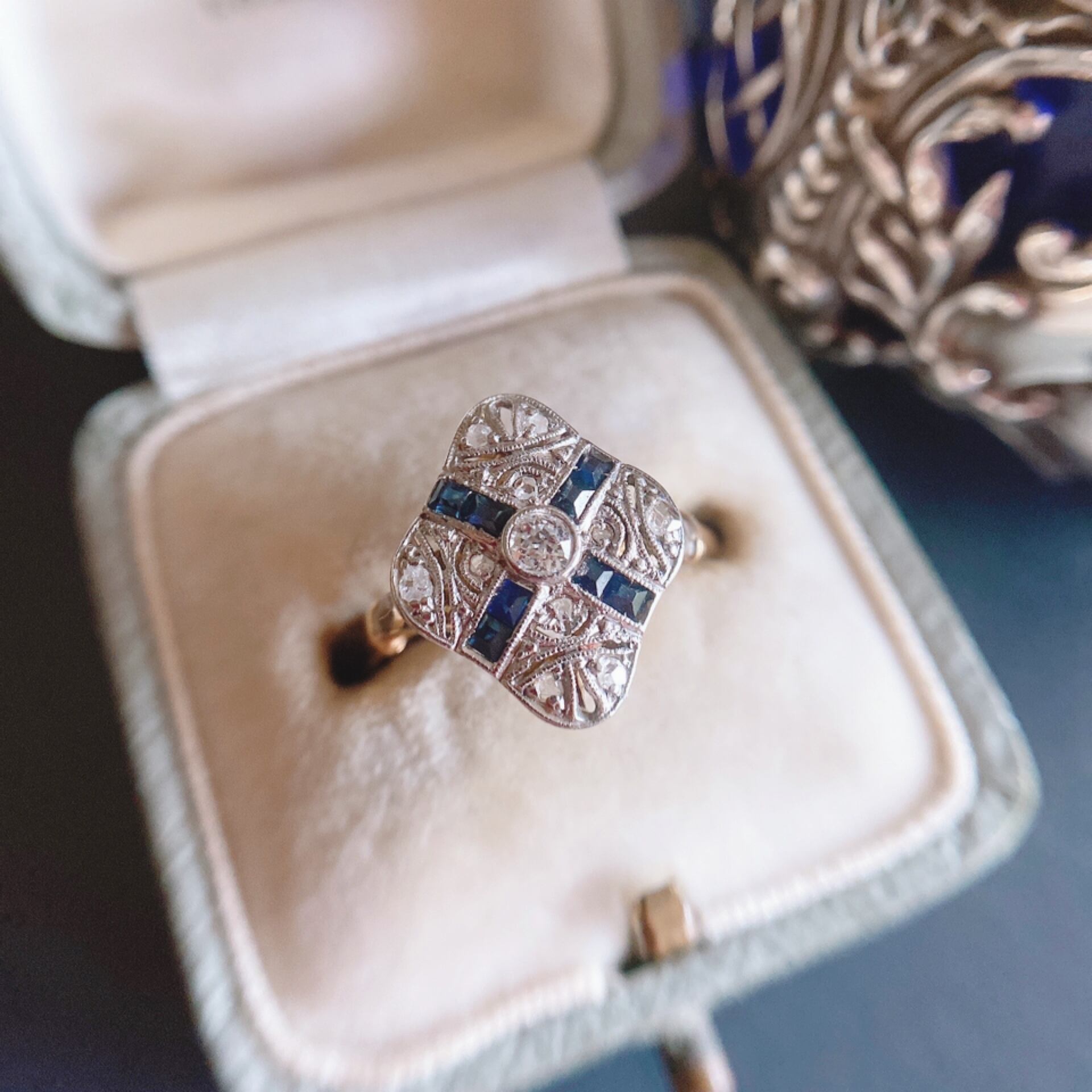 透し彫り、ミルグレイン、カリブレカットサファイア、オールドヨーロピアンカットダイヤモンド、いいとこ取りのリングが届きました。